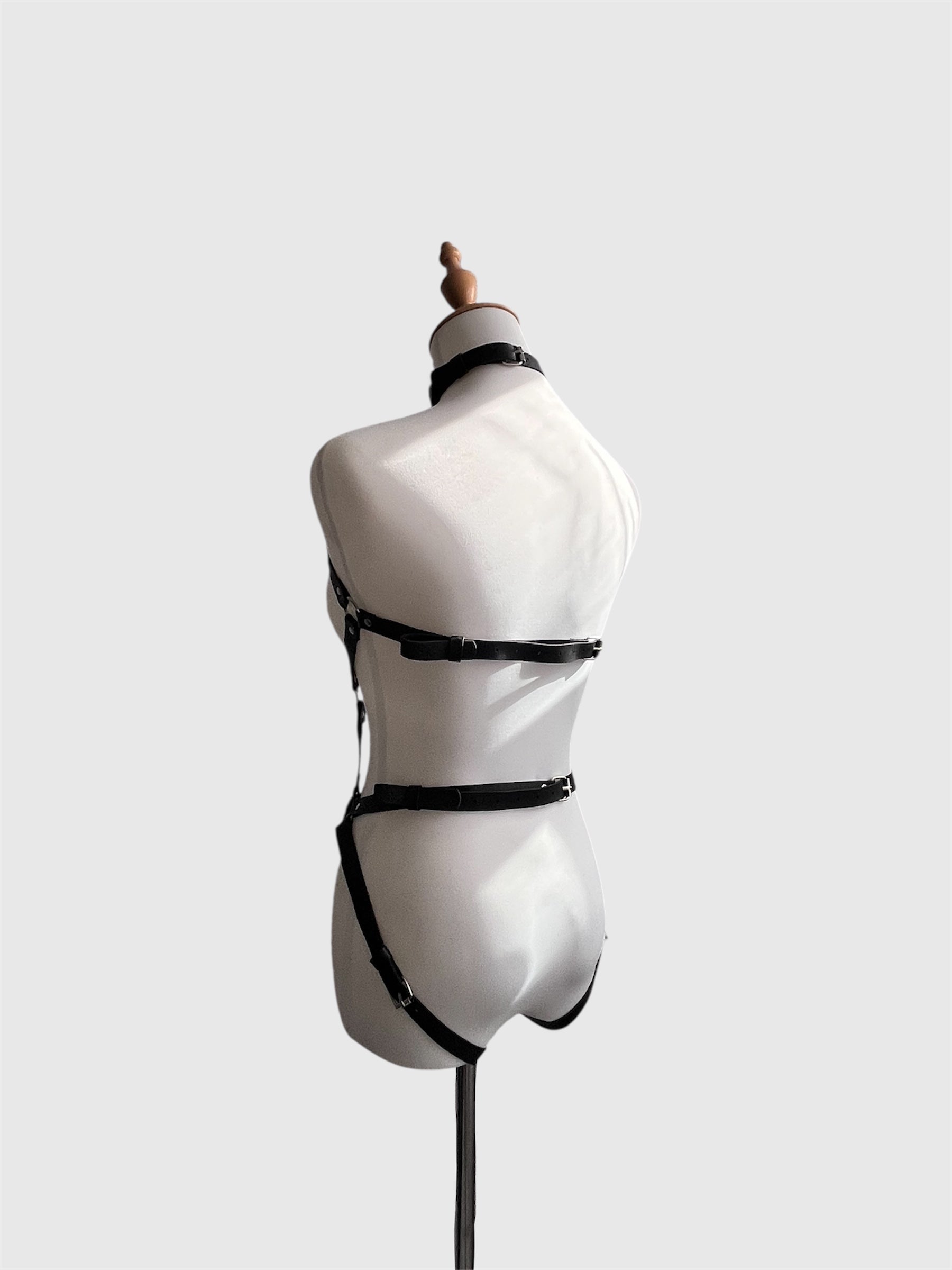 Arnés de tiras imitación piel con hebillas ajustables en espalda, cintura y piernas. Remaches metalicos.