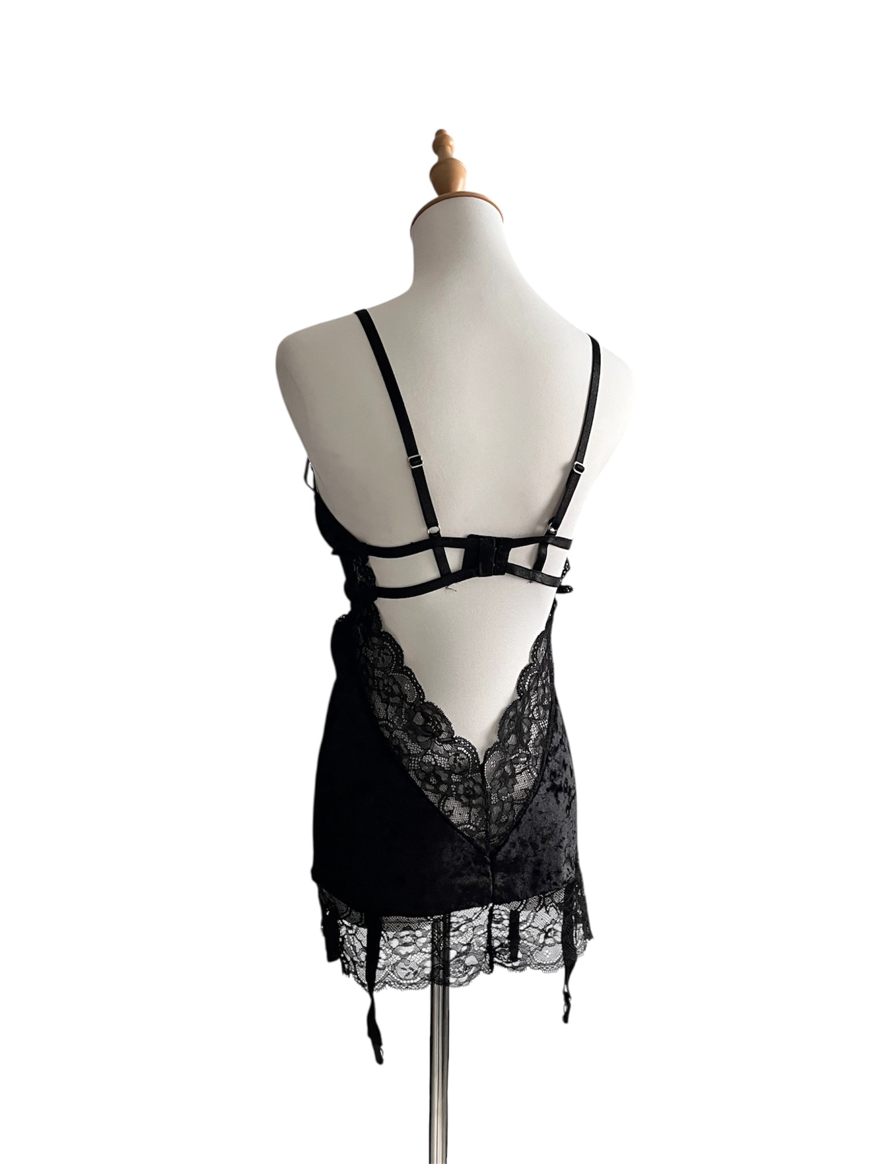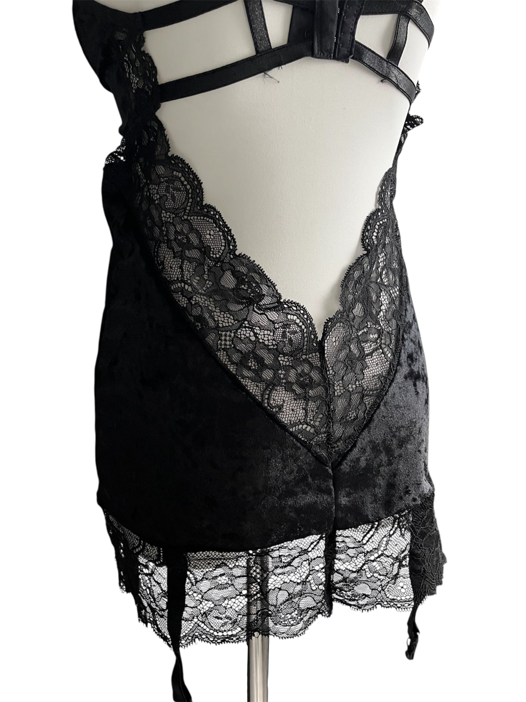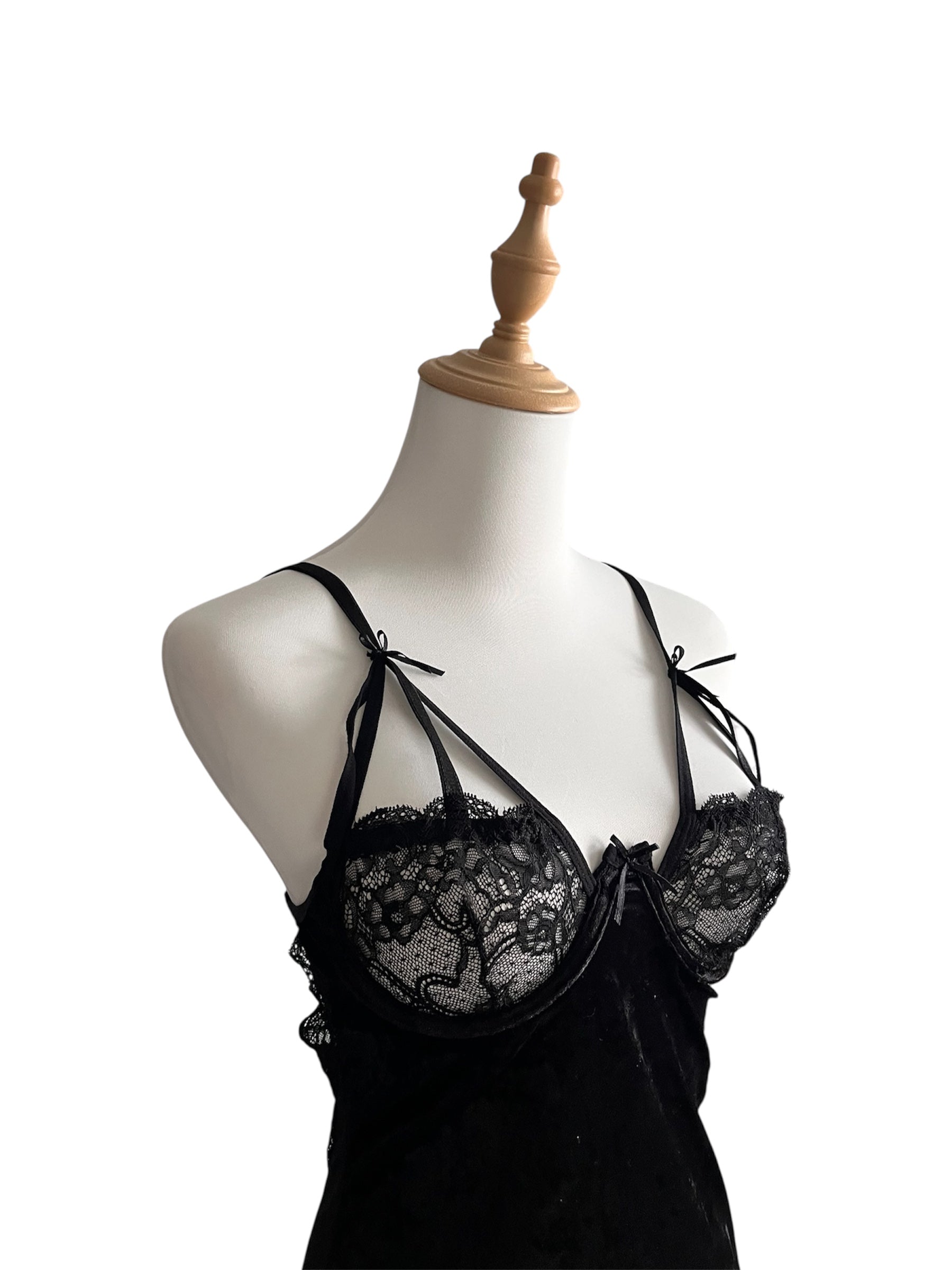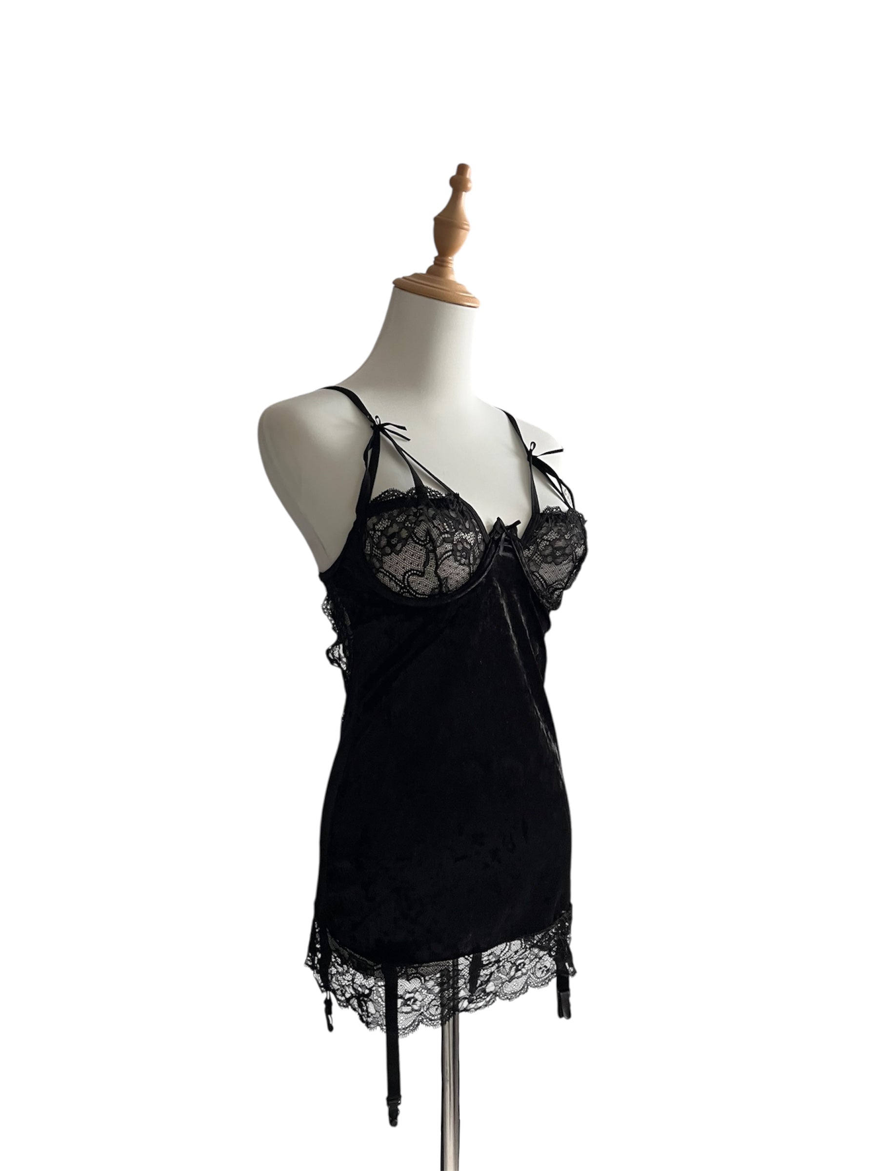 Vestido lencero de terciopelo con liguero, detalle de encaje en pecho. Tanga de hilo.