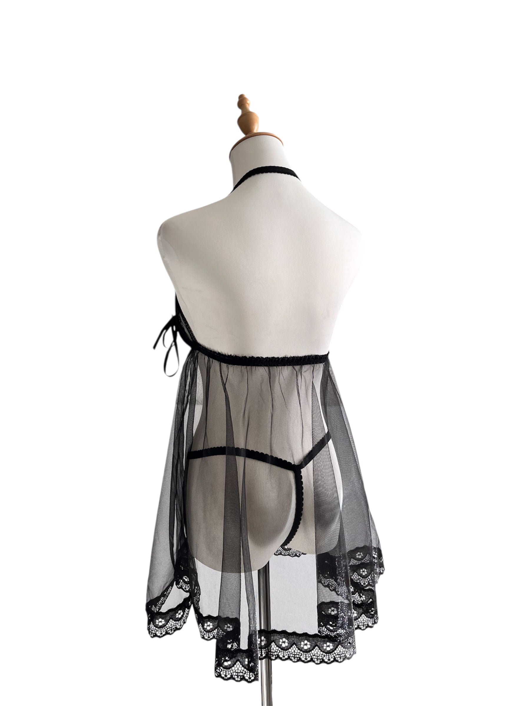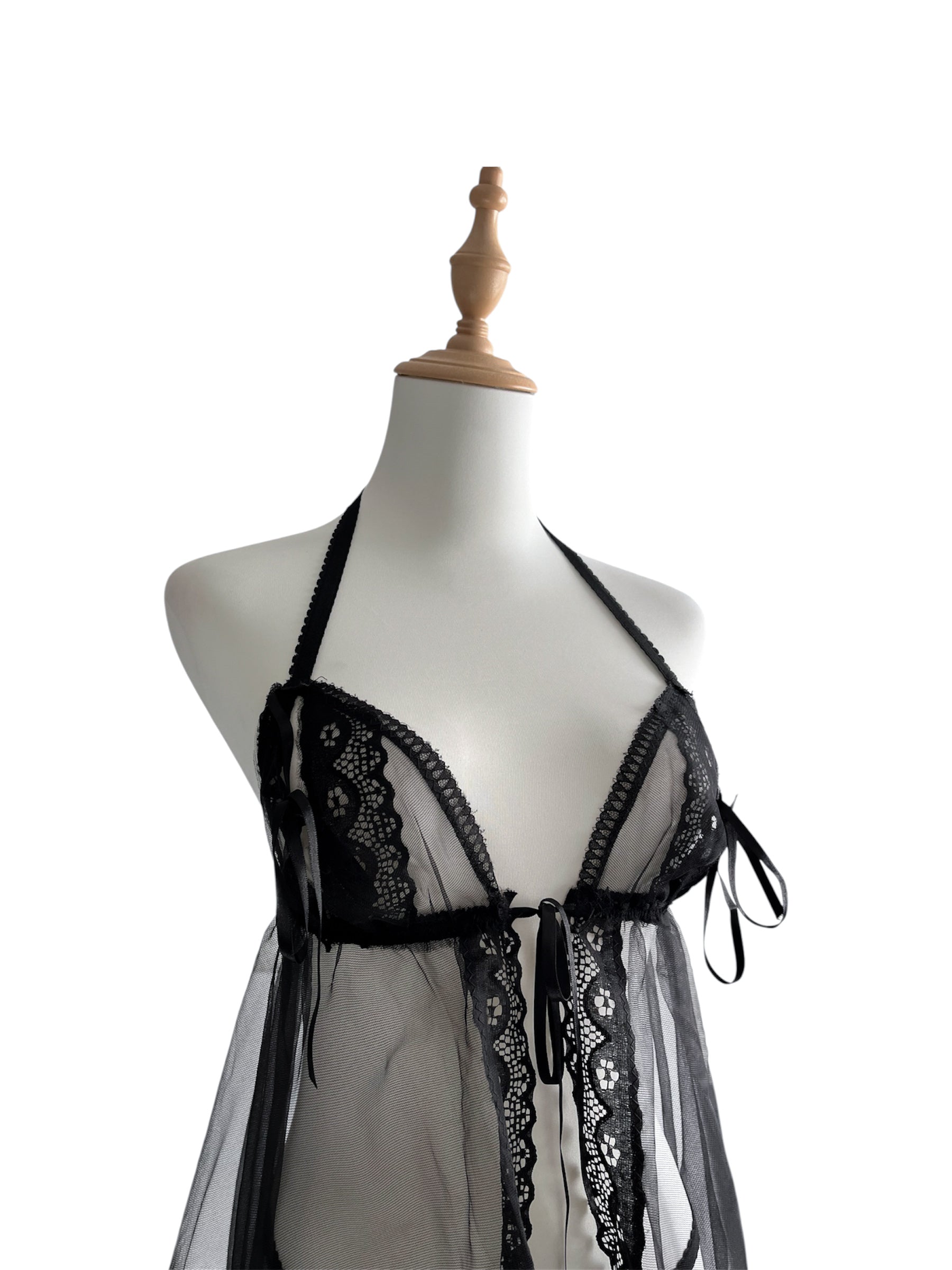 Vestido halter de tul con detalles de encaje, detalle de listones en pecho. Abertura frontal.