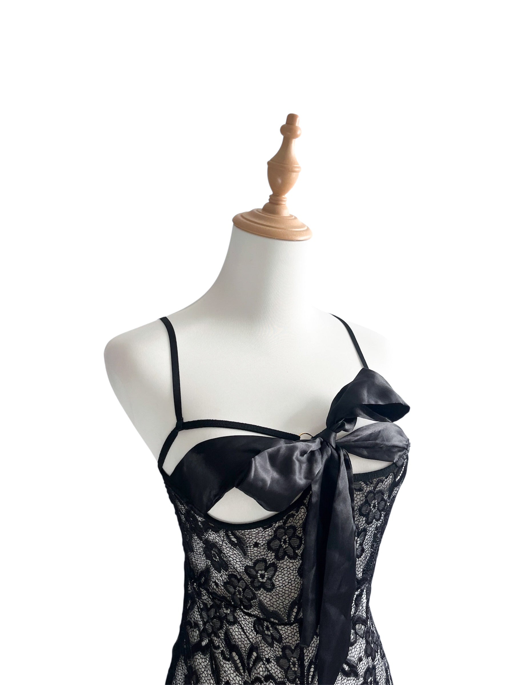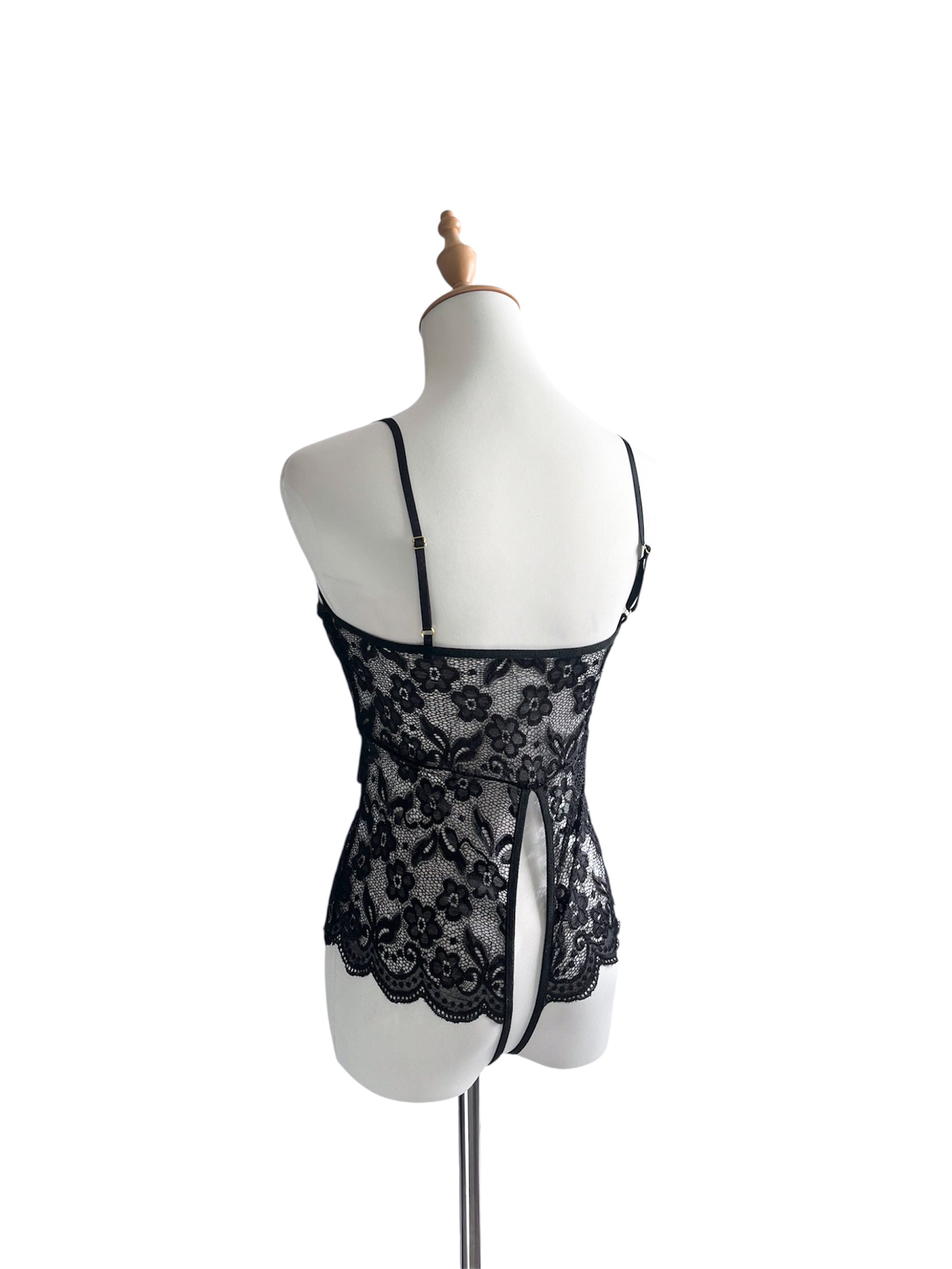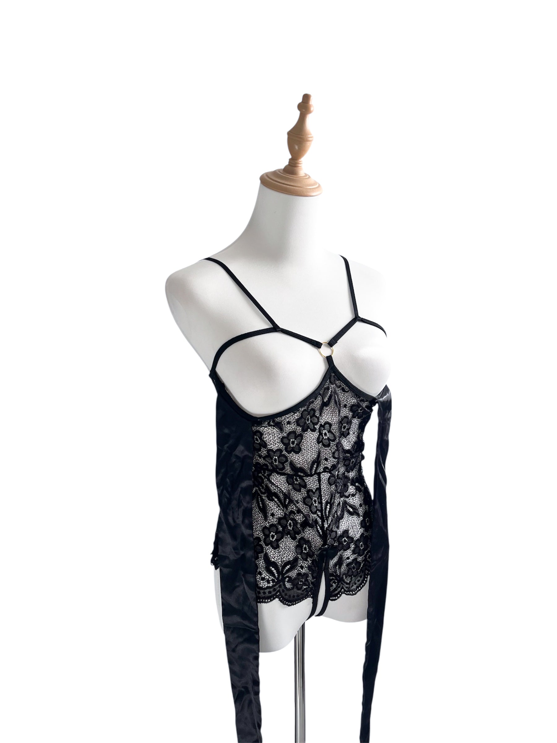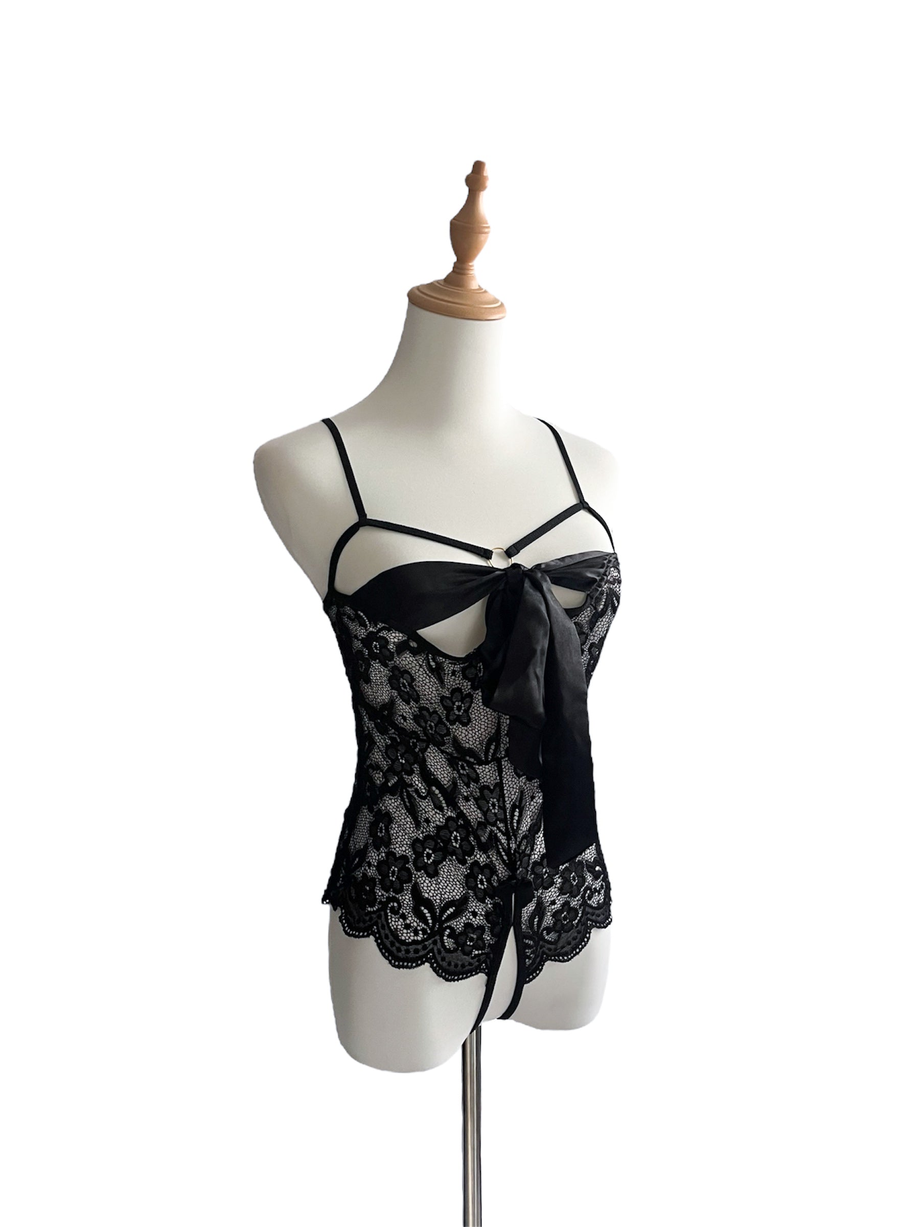 Body de encaje con tirantes ajustables, abertura completa en pantaleta y busto. Cintas de satin para armar moño frontal.