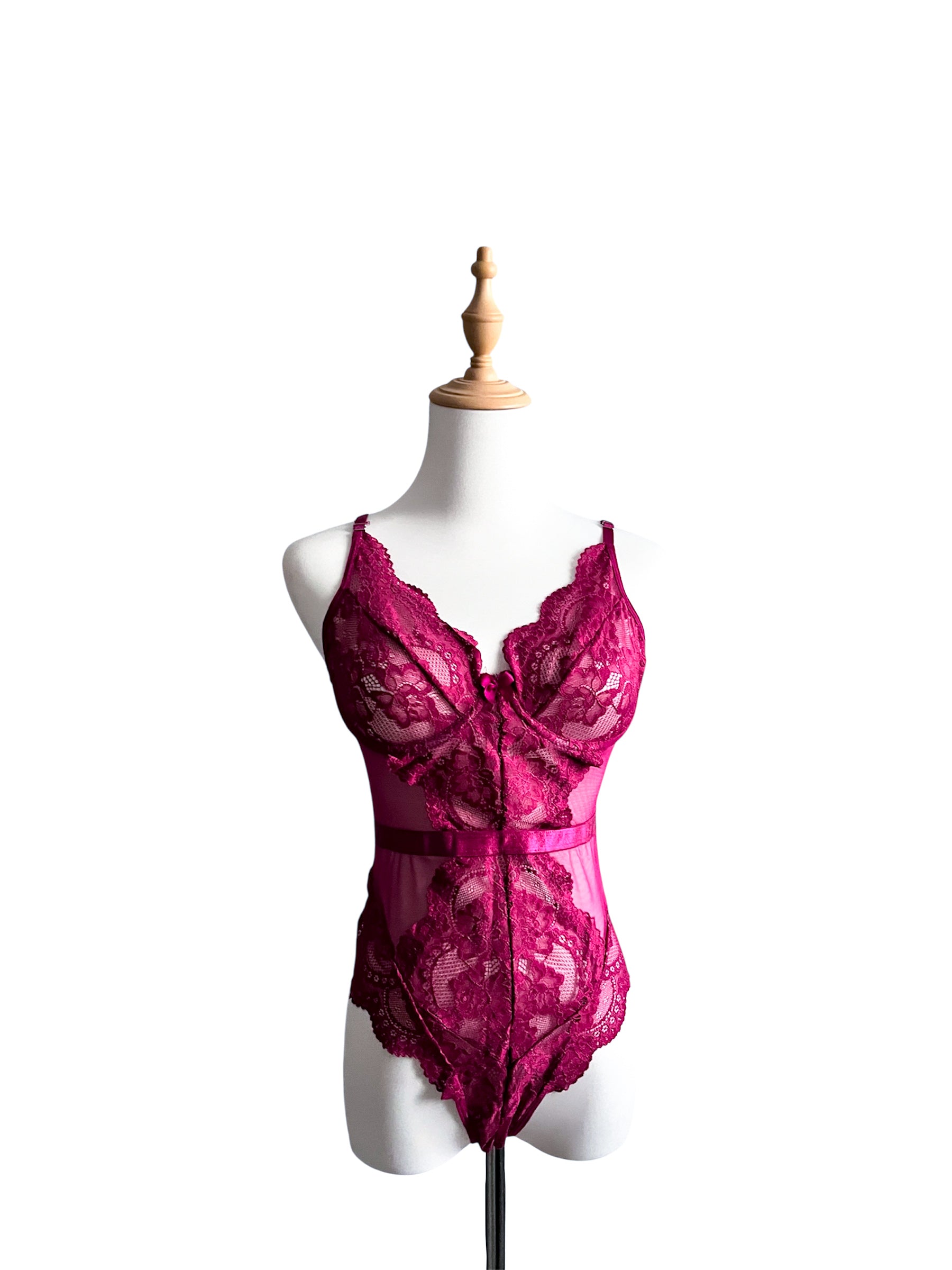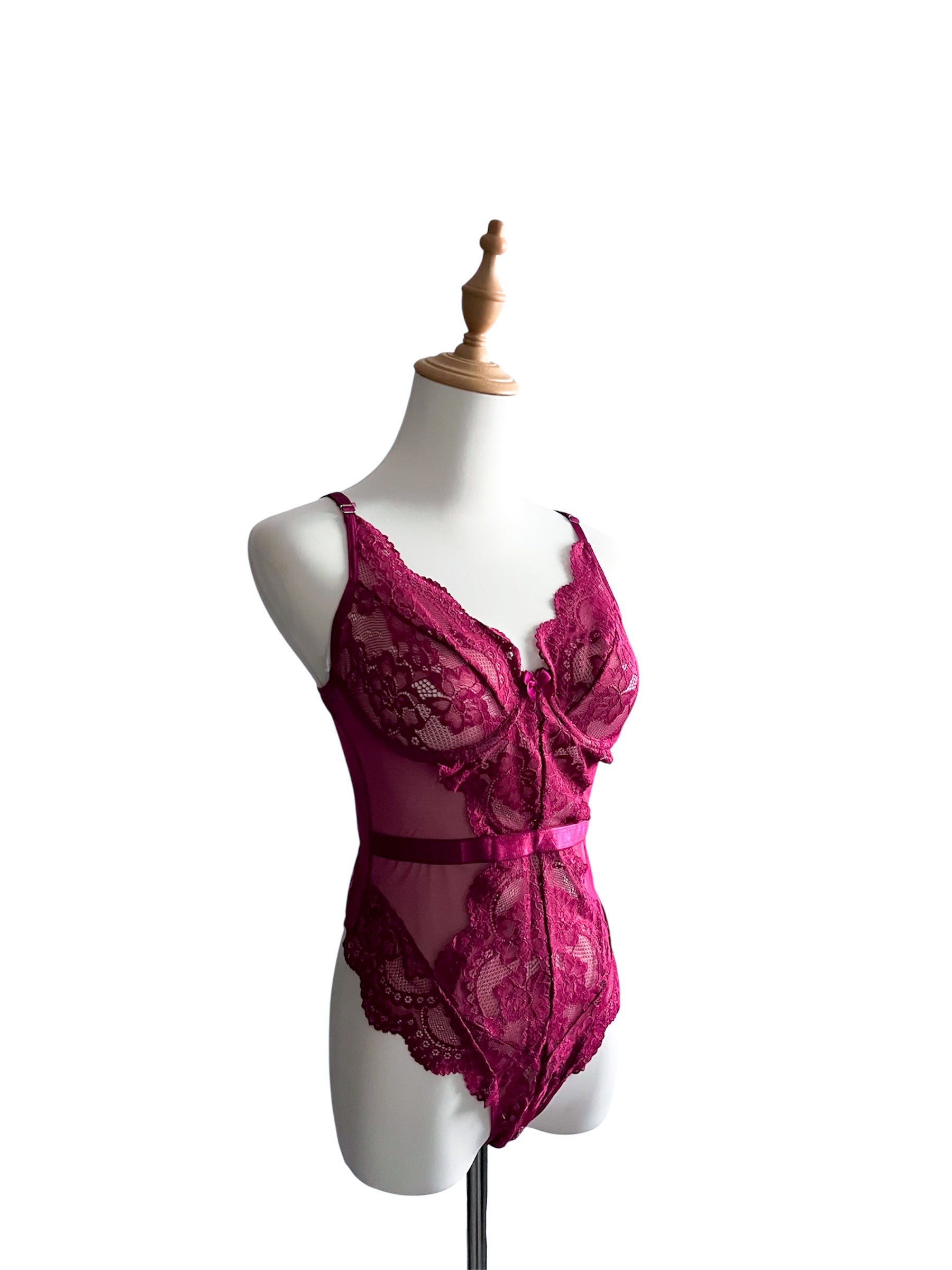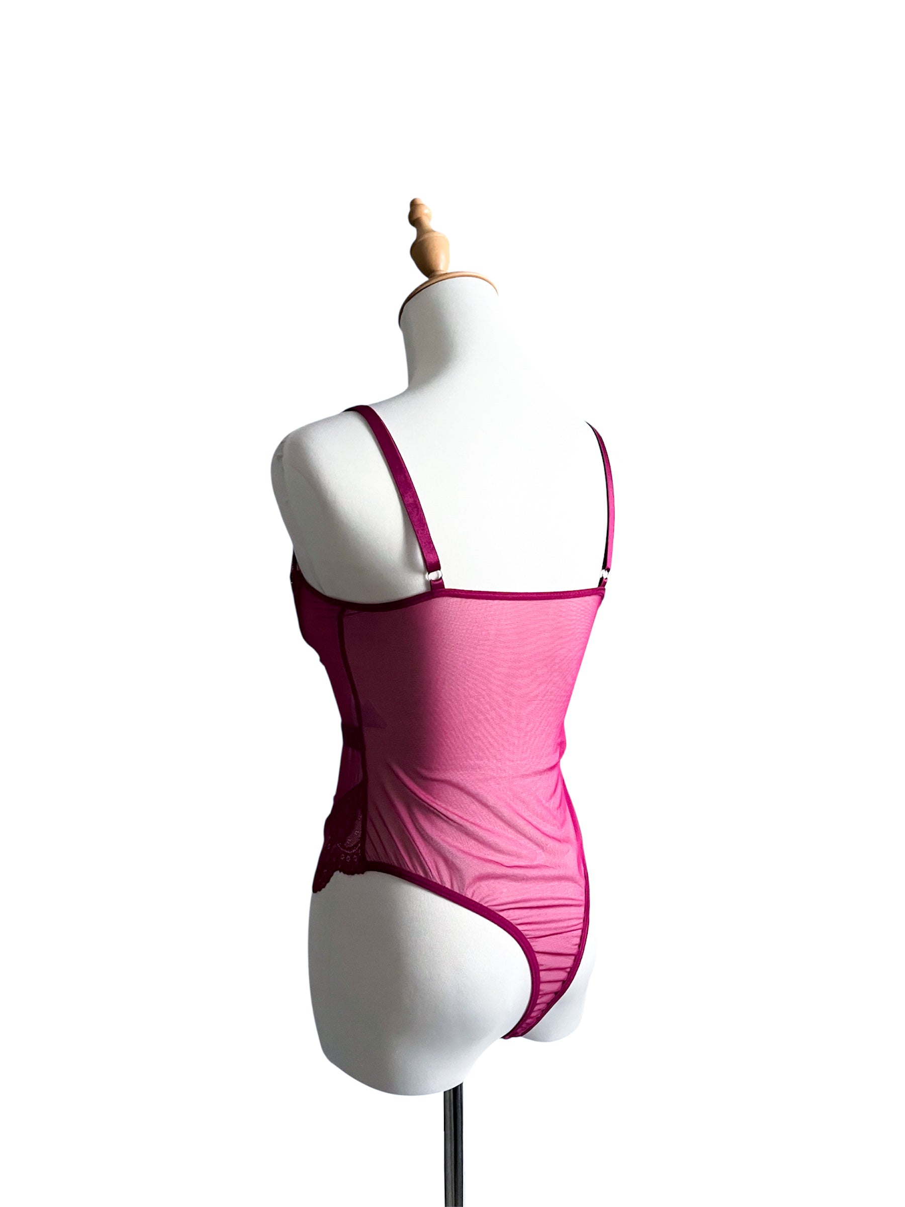 Body de encaje grabado con encaje mesh. Ajustable en tirantes, con puente de algodón sin broche en entrepierna.