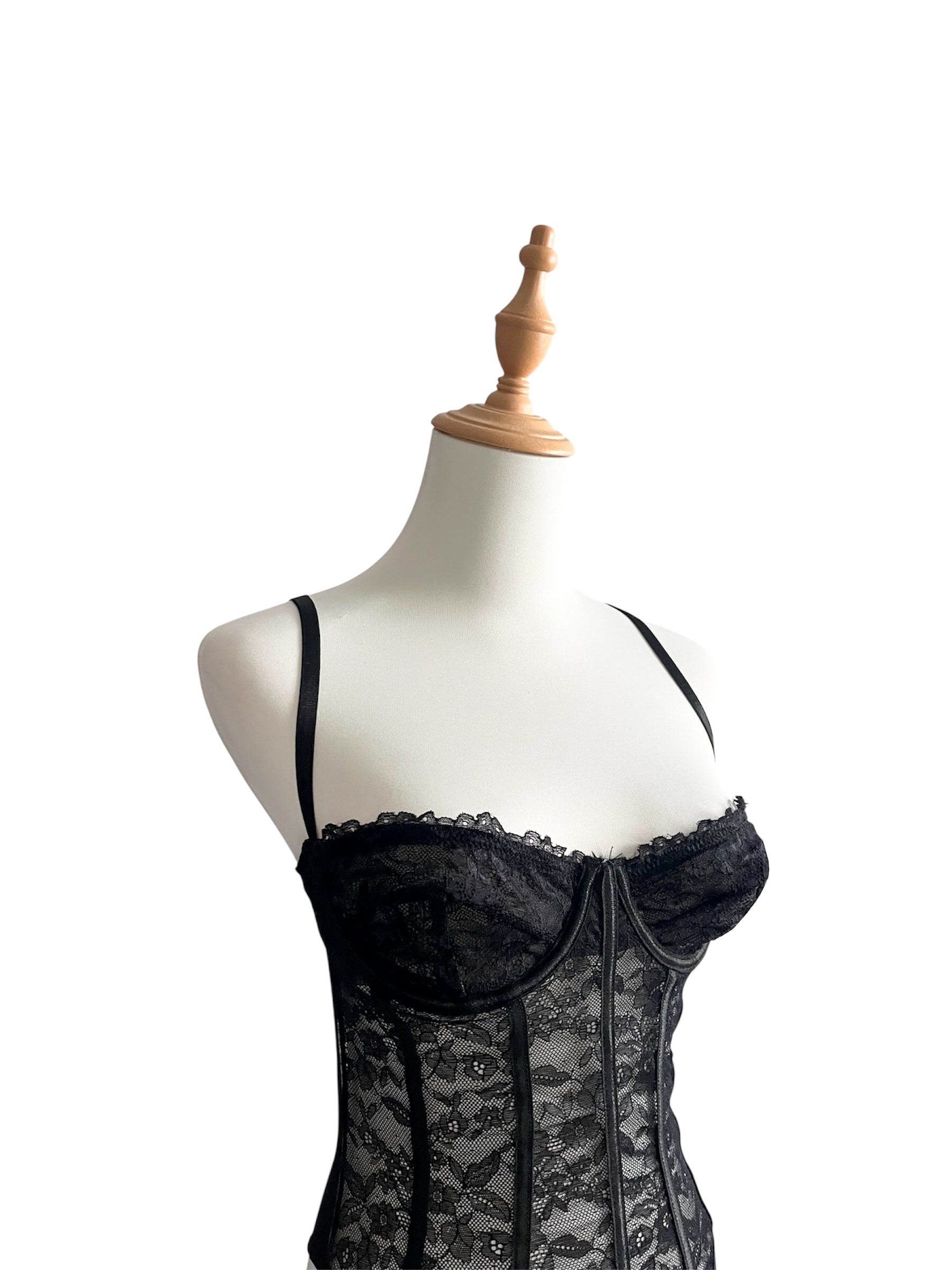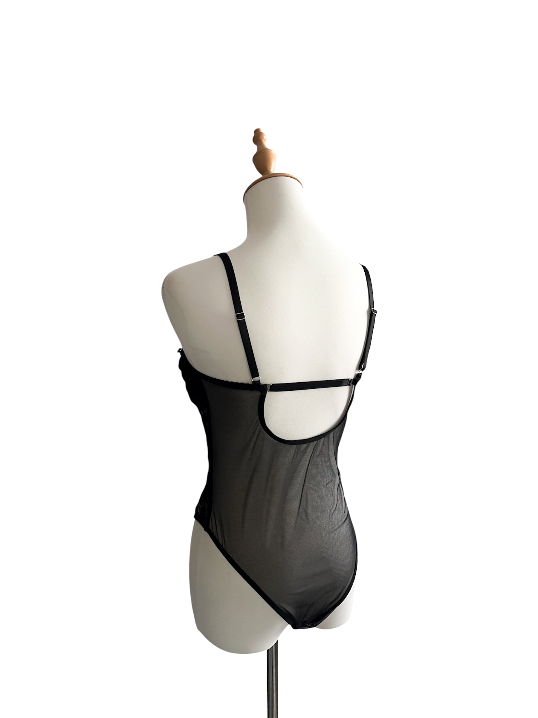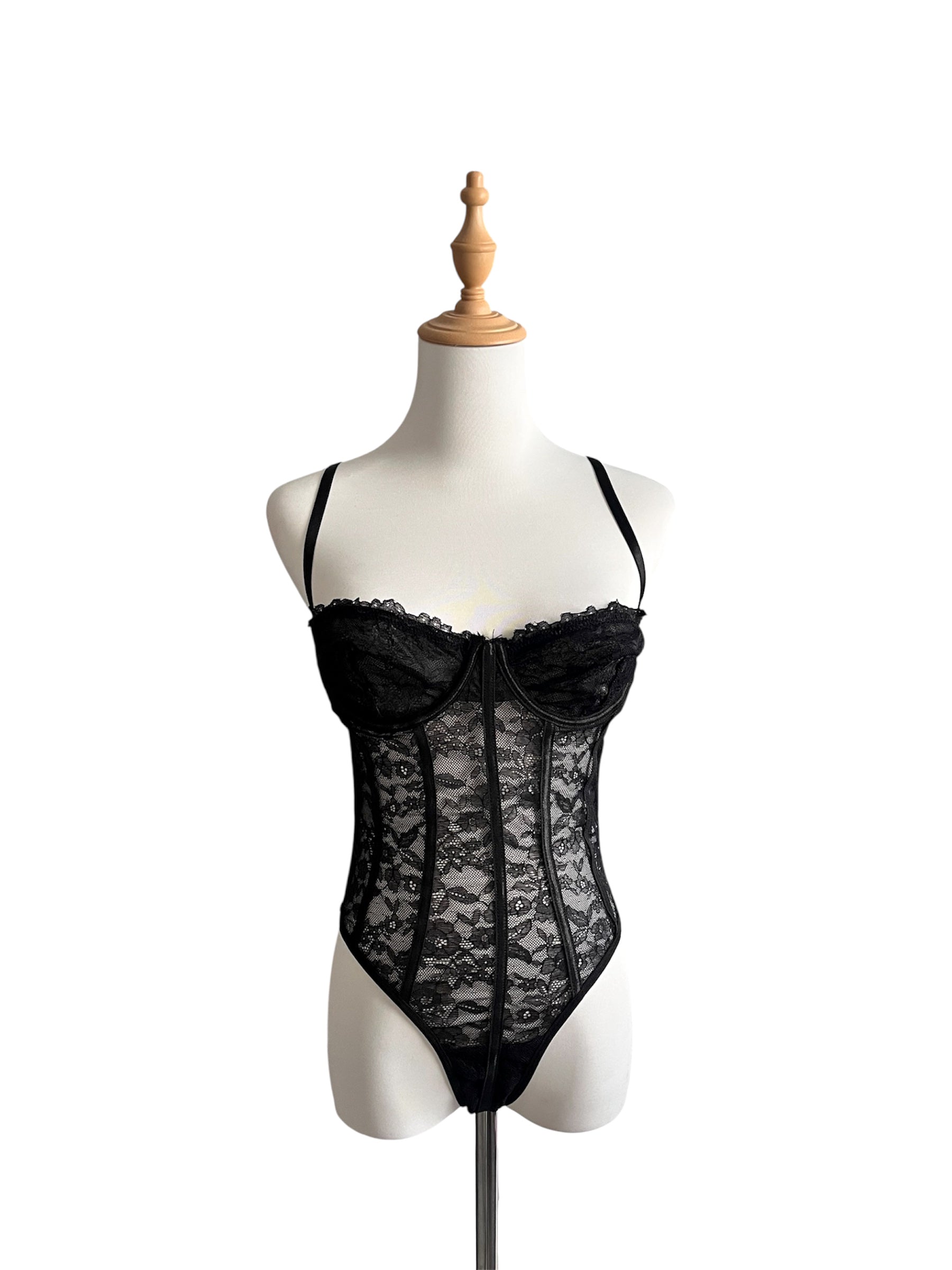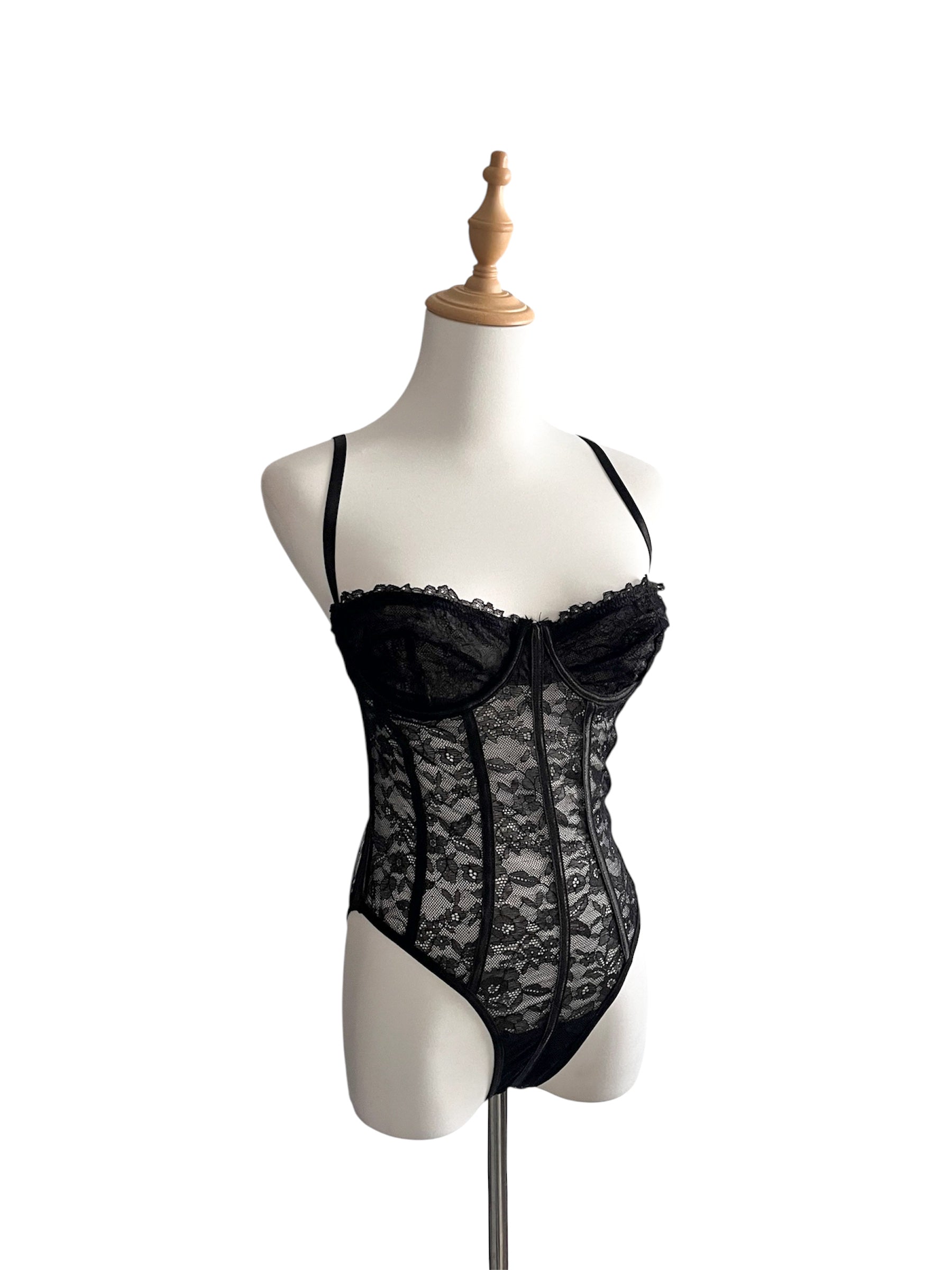 Body de encaje mesh con encaje grabado. Tirantes ajustables en hombros y espalda, con varilla y copa suave. Tiras de corset suaves en parte frontal.