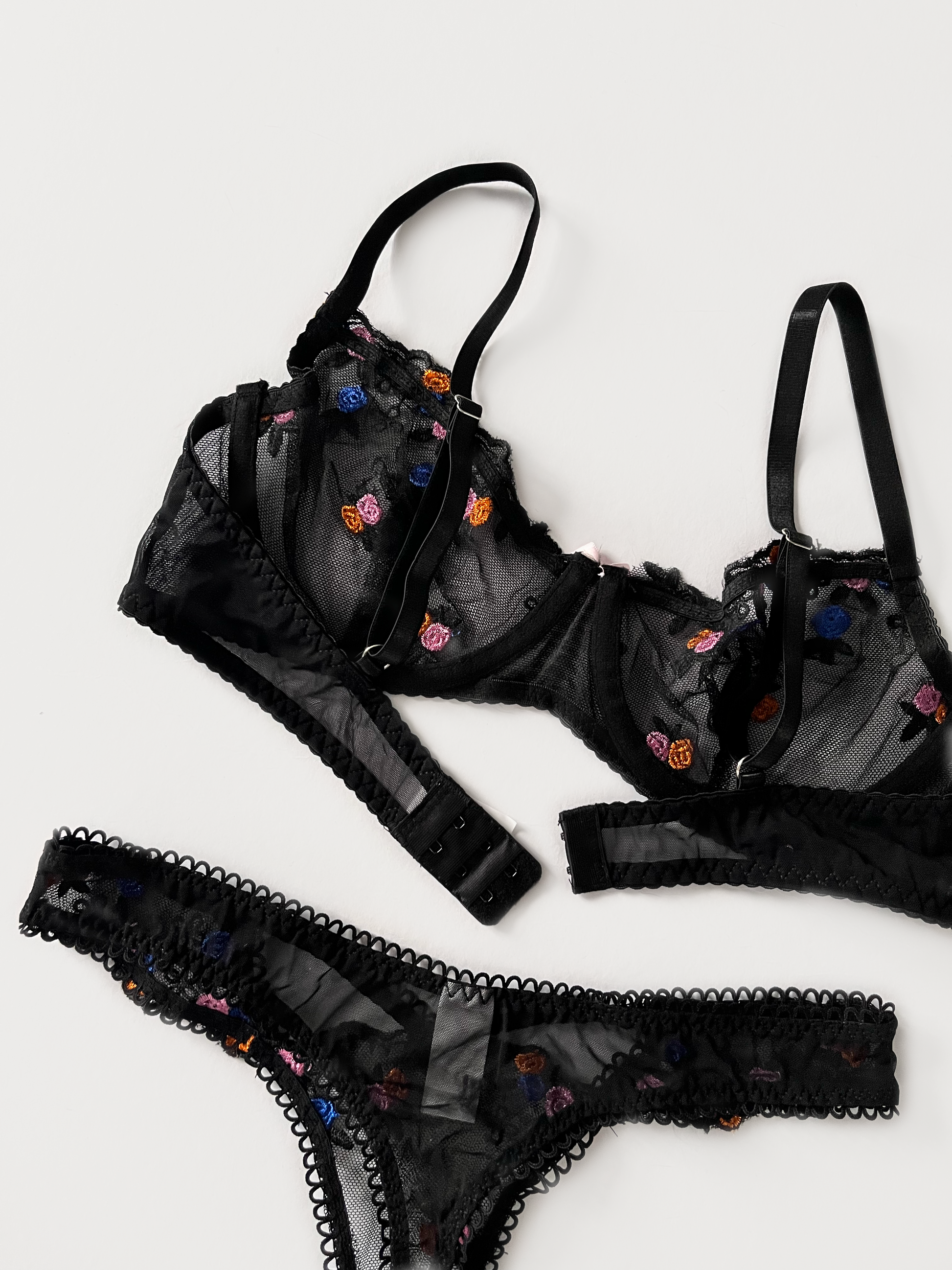 Conjunto de encaje mesh con detalles bordados. Ajustable en brassiere de torso y tirantes. Puente de algodón en pantaleta. Corte tanga.