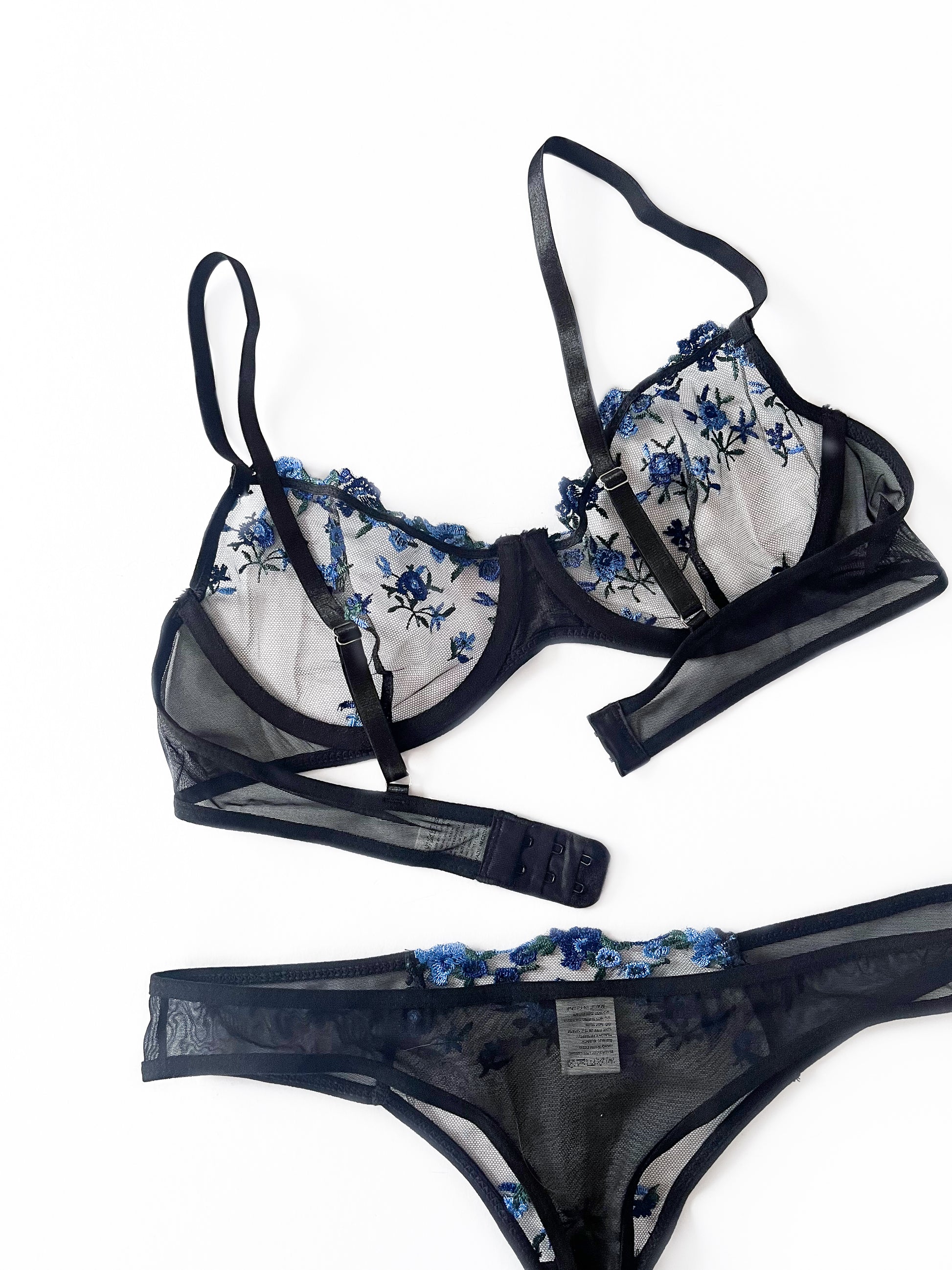 Conjunto de brassiere sin copa, con varilla y tirantes ajustables, pantaleta con puente de algodón corte tanga.