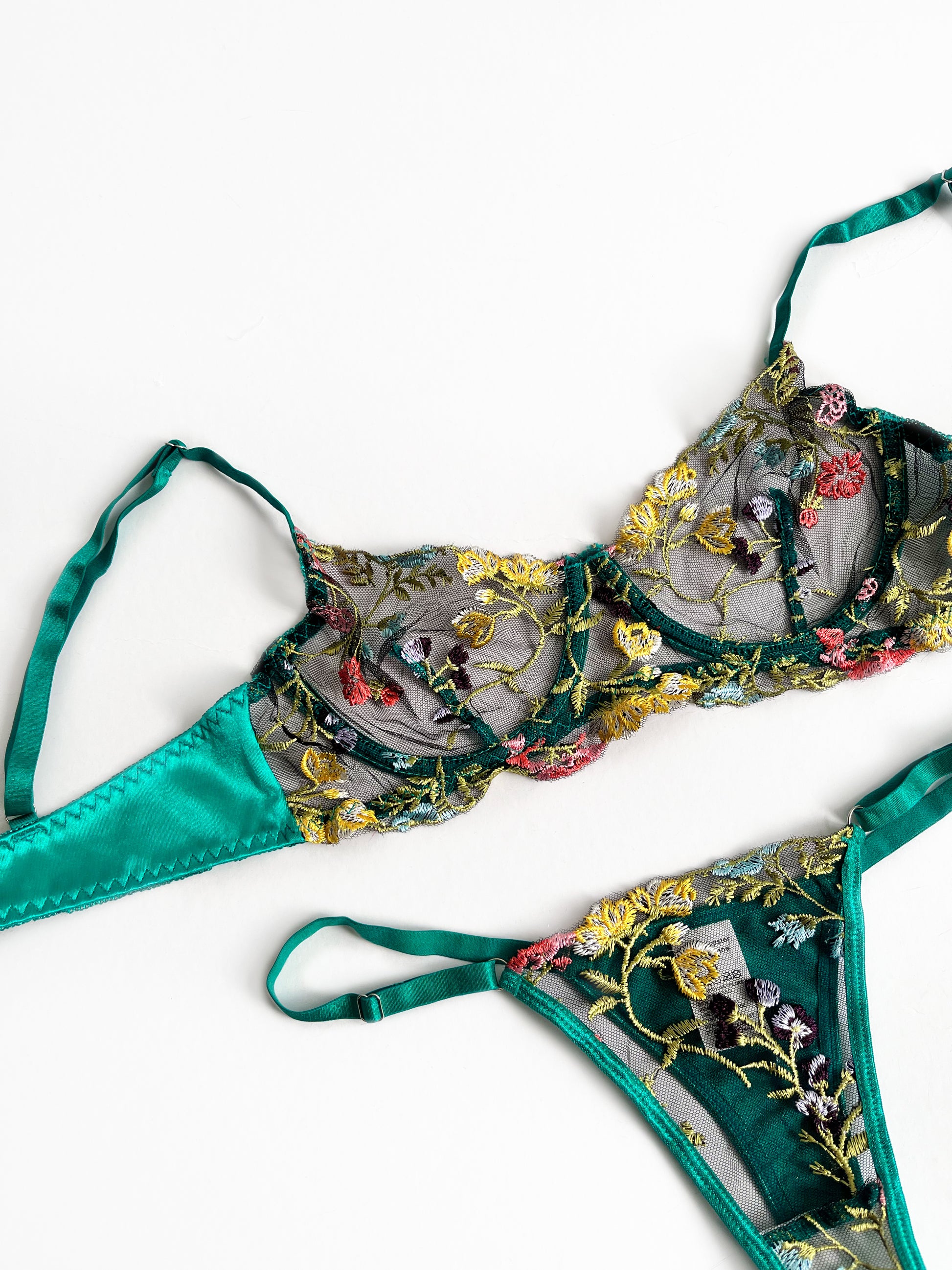 Conjunto satinado con bordado, brassiere con ajustables y con varilla, pantaleta ajustable con puente de algodón.