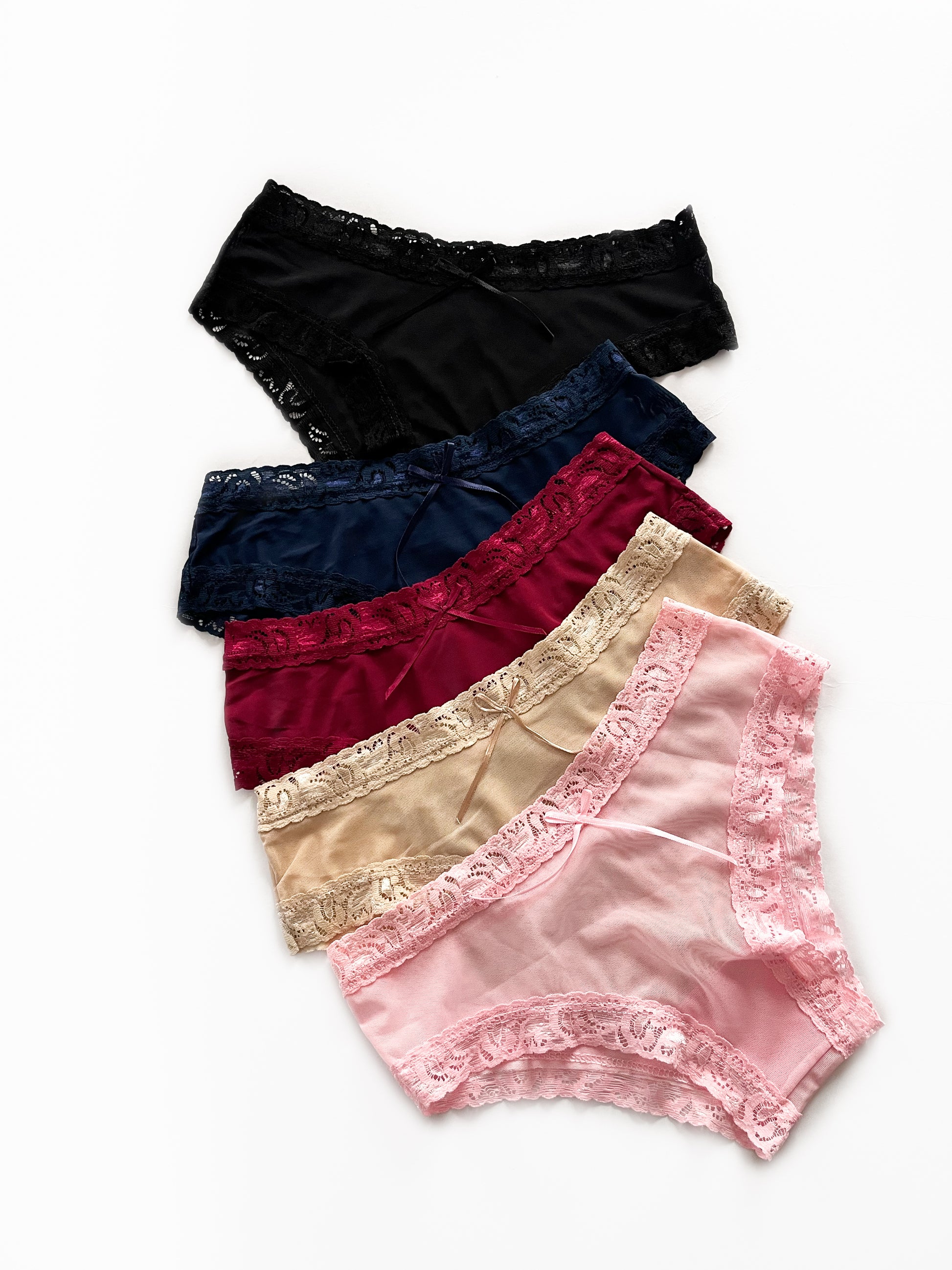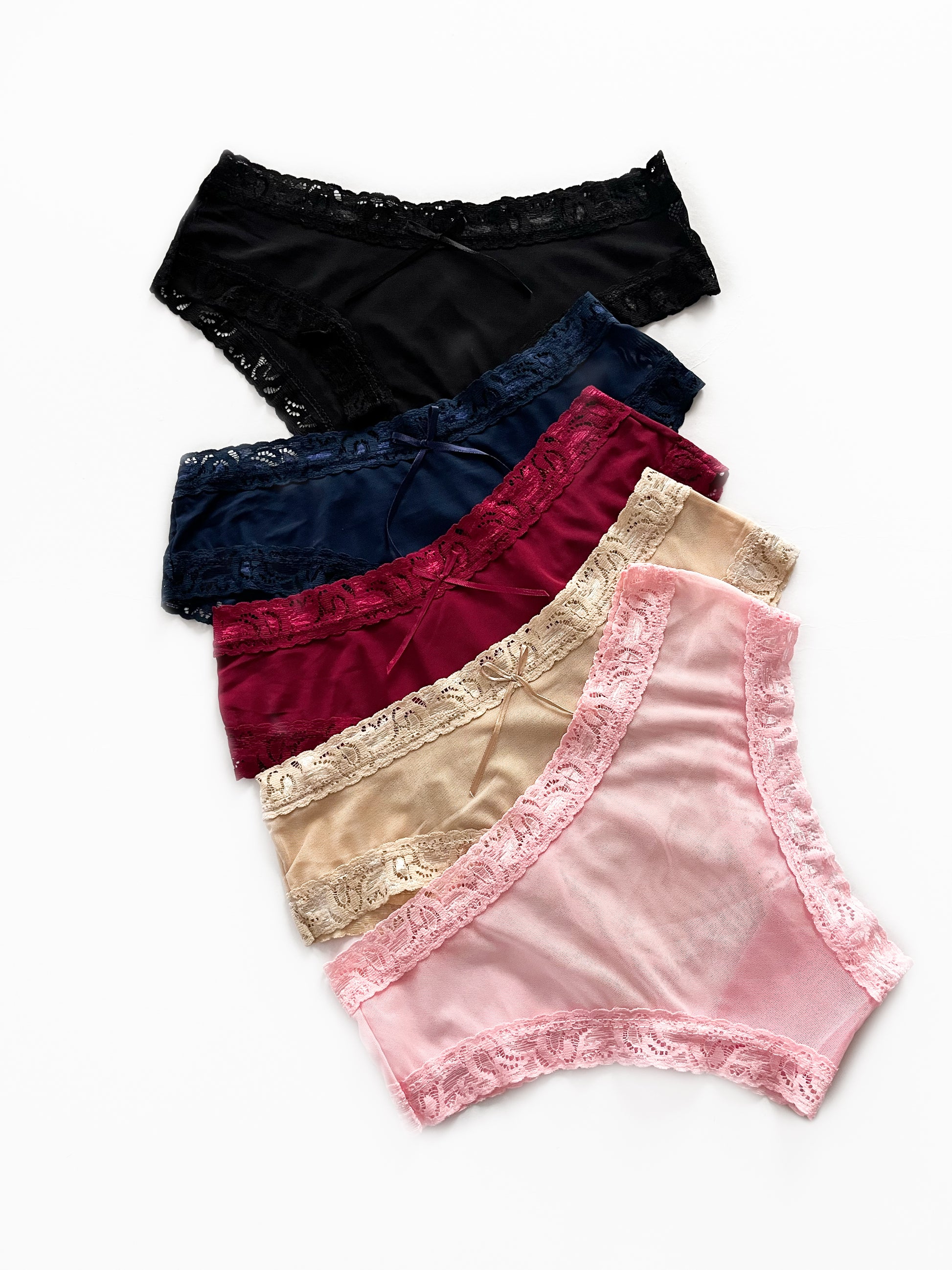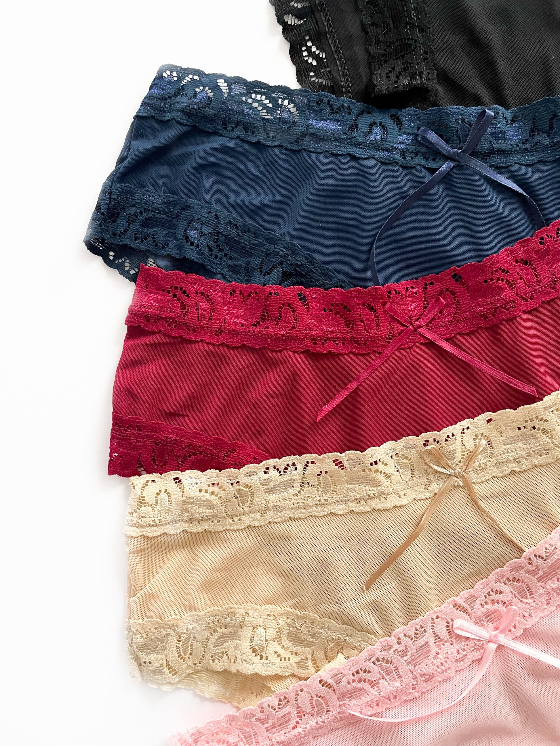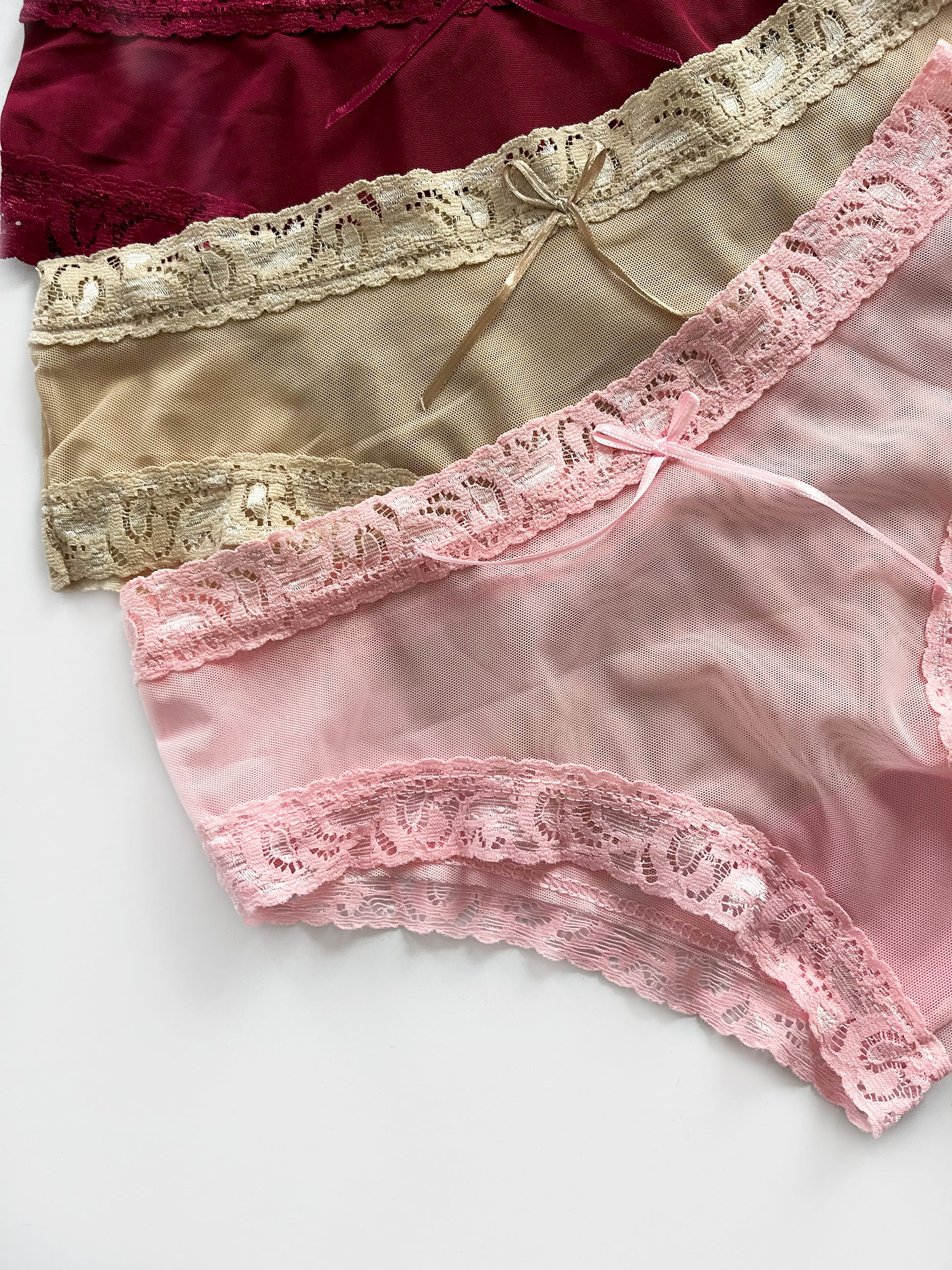 Set de pantaletas con encaje mesh y orilla de encaje grabado. Puente de algodón.