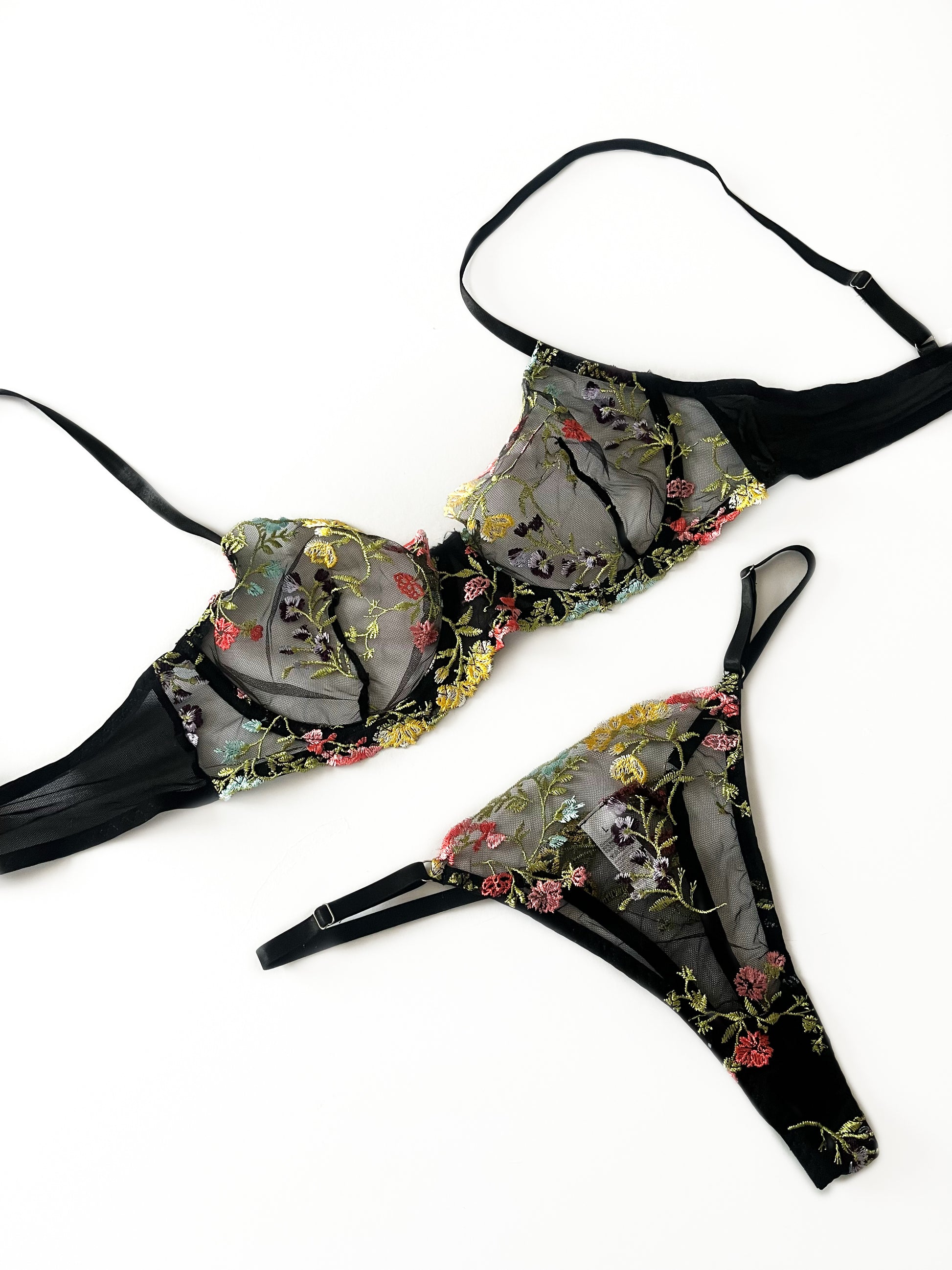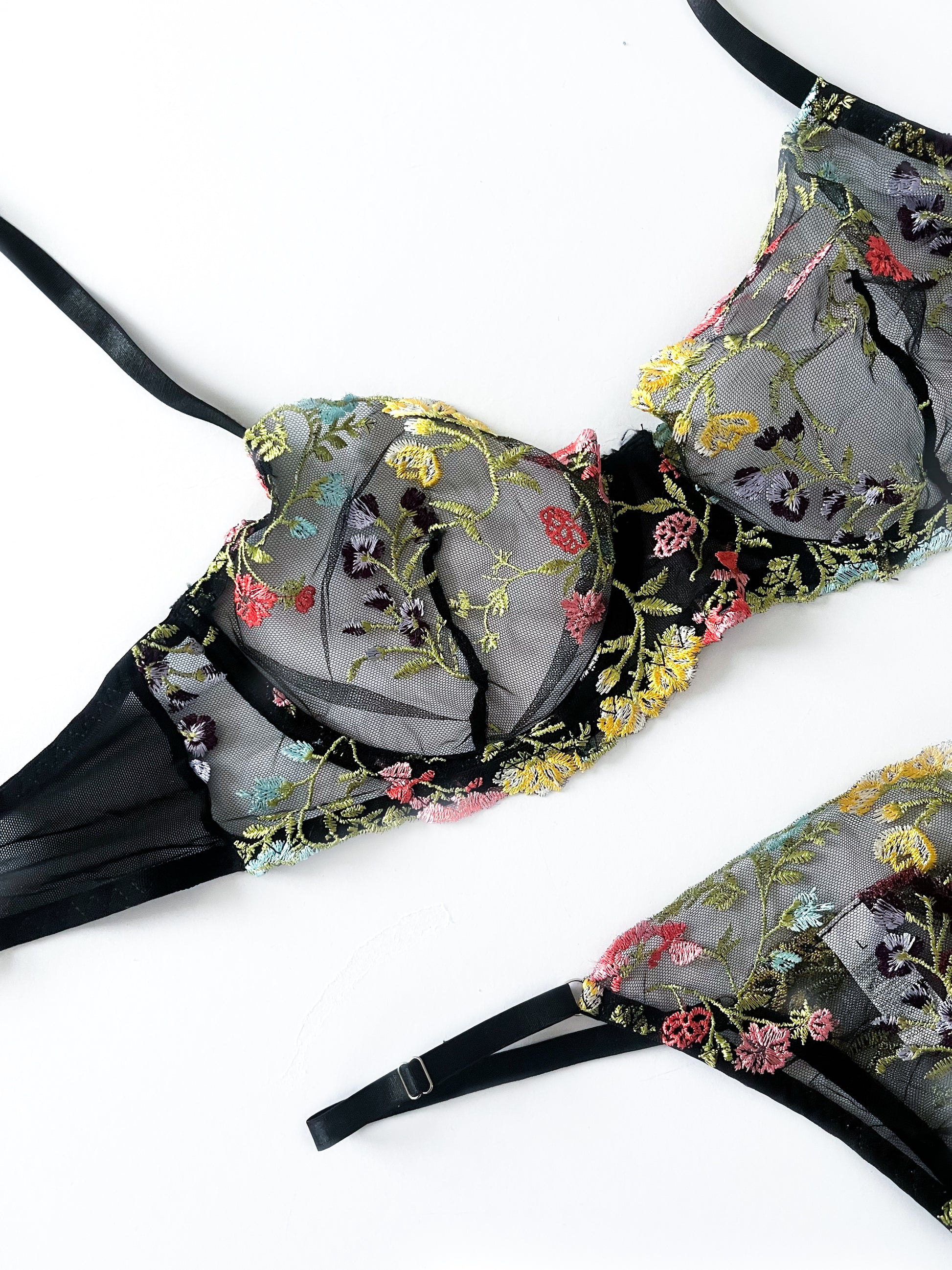 Set de encaje bordado. Ajustable en tirantes, pantaleta ajustable y con puente de algodón. Broche en espalda en 3 posiciones.