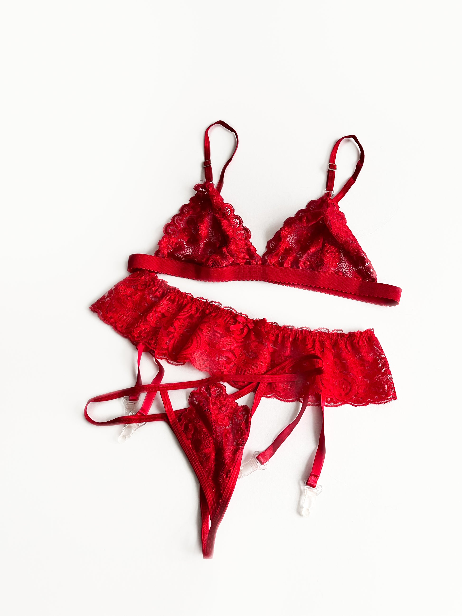 Incluye: 1 bealette, 1 tanga, 1 liguero, 1 par de medias.