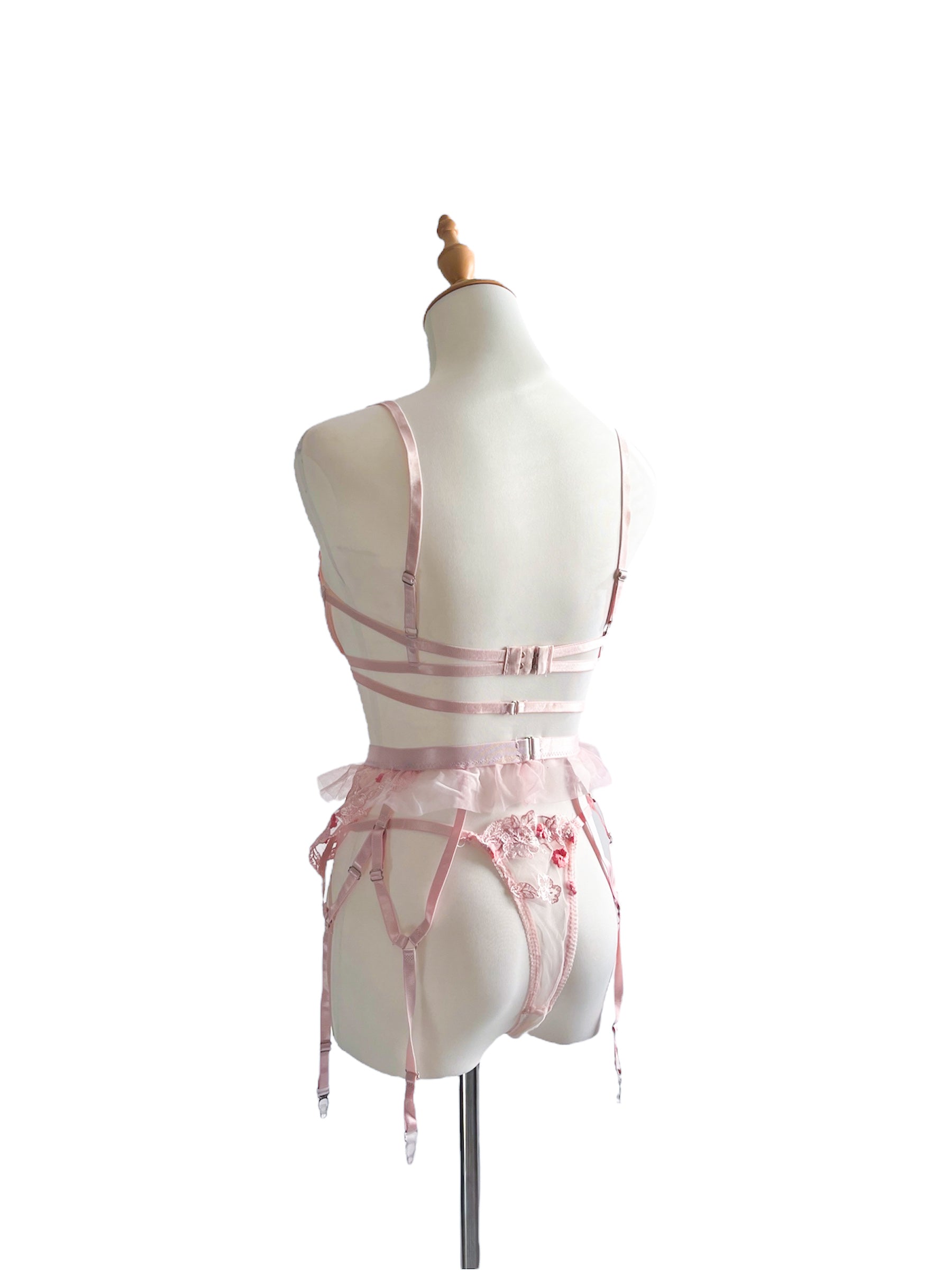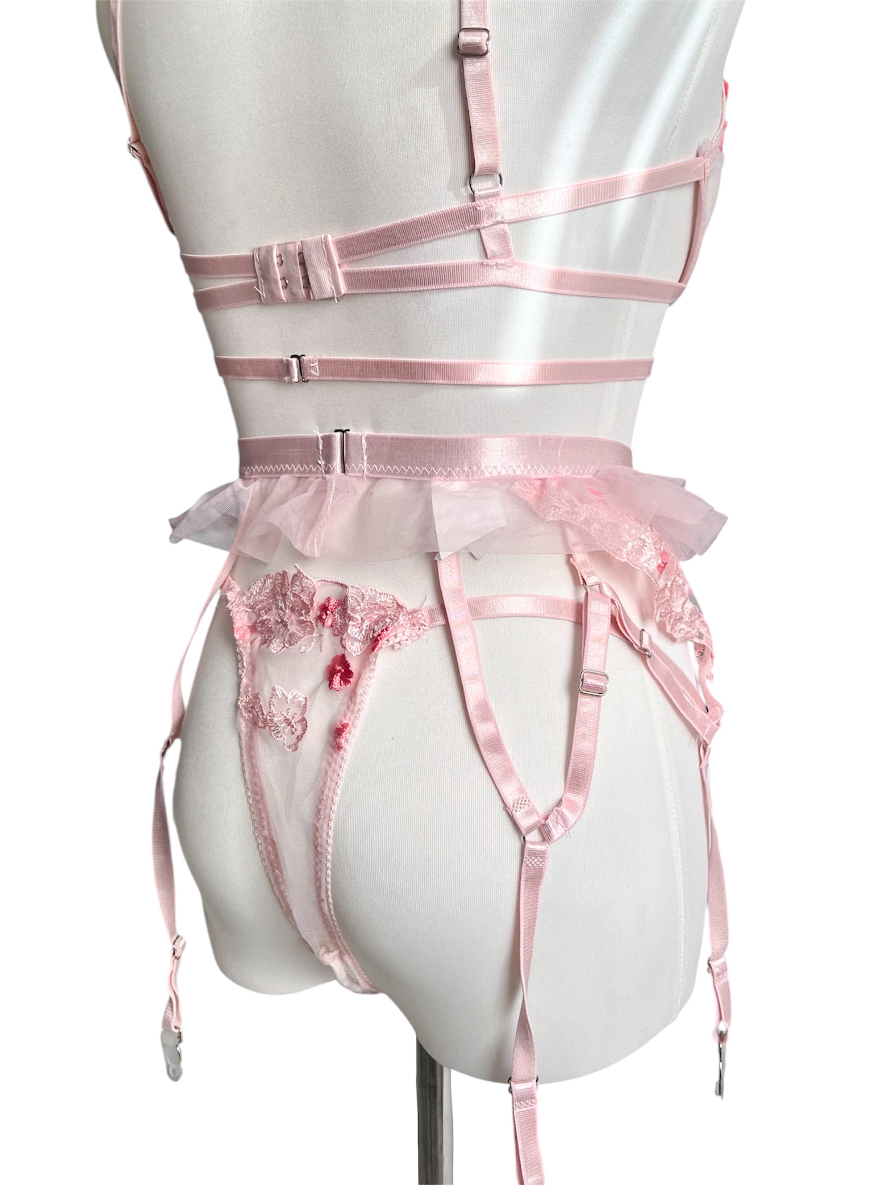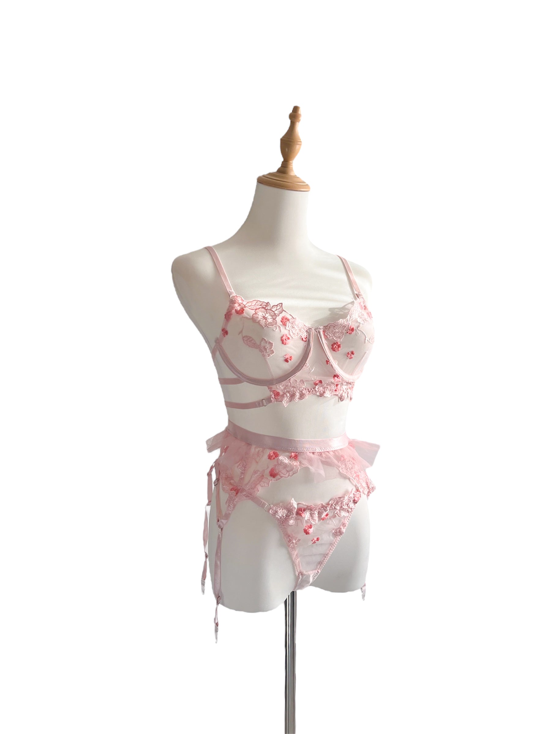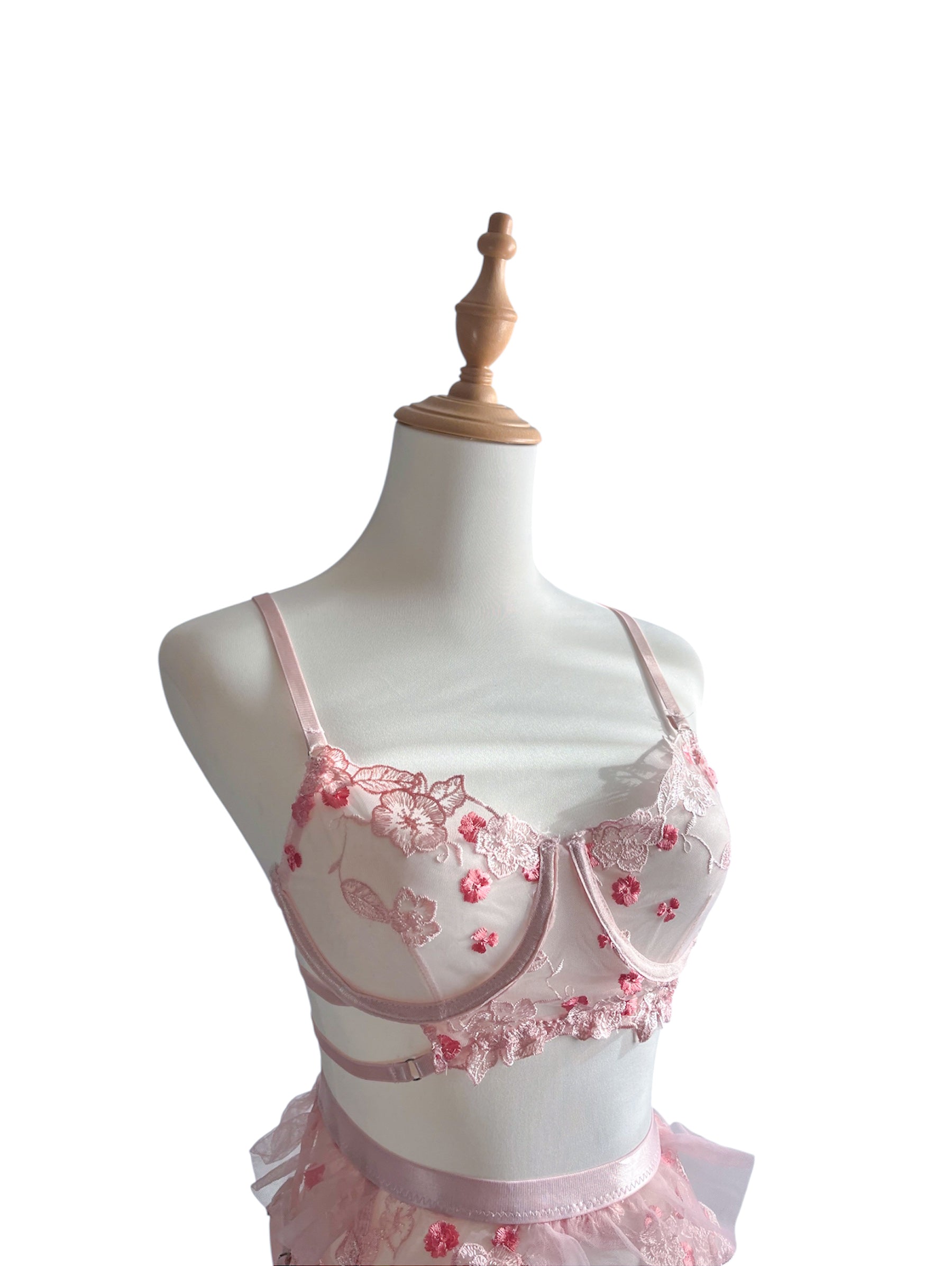 Set de liguero con encaje de flores bordadas. Brassiere con varilla ajustable en tirantes. Pantaleta con puente de algodón. Liguero con detalles de tul.