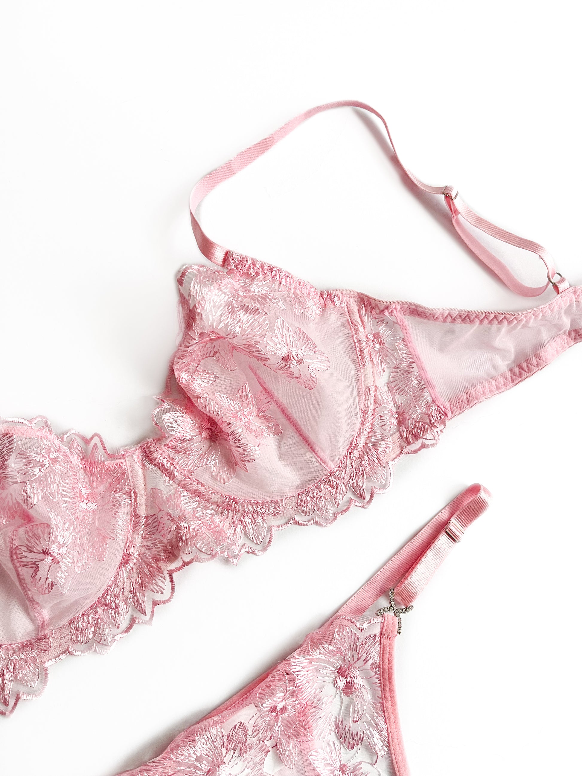 Set de encaje satinado, brassiere con varilla y tirantes ajustables, pantaleta ajustable con puente de algodón.