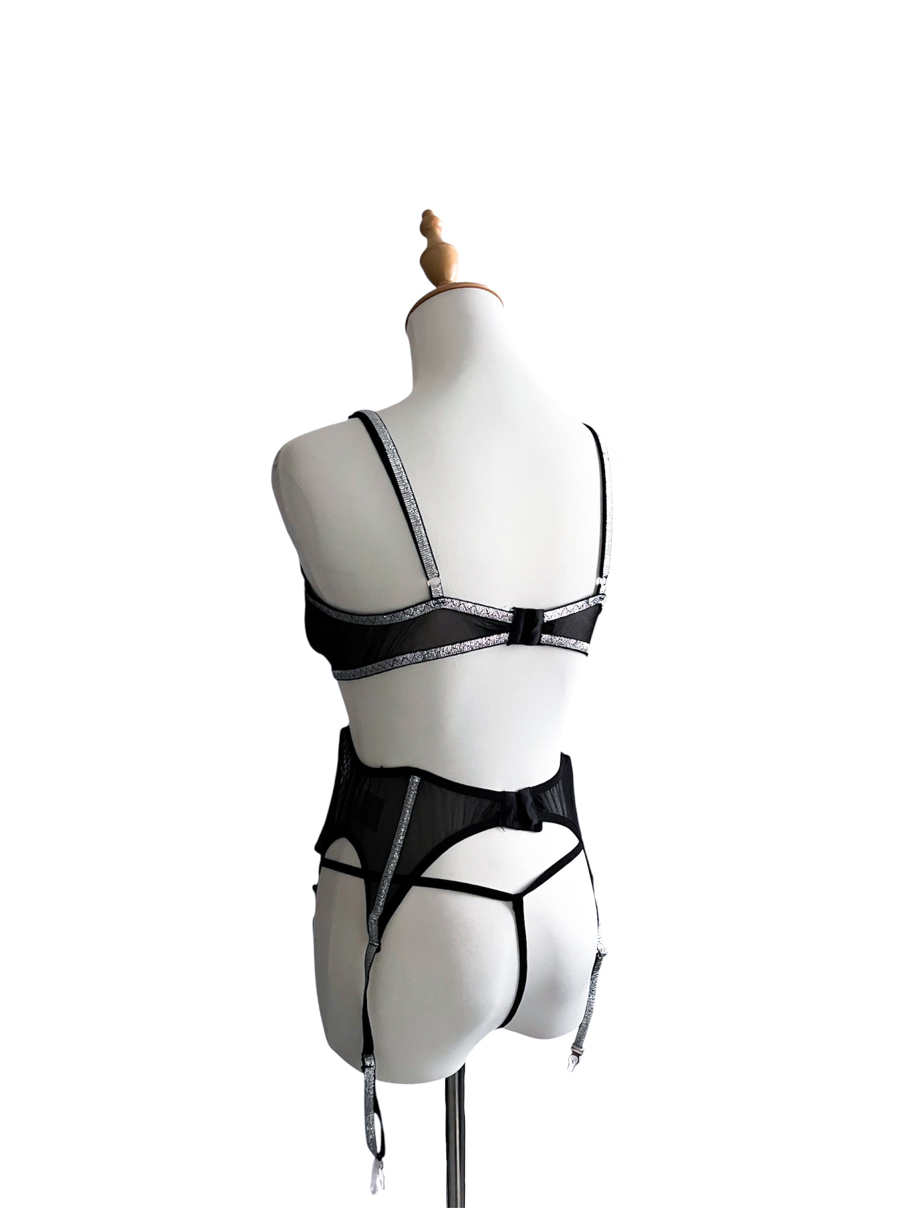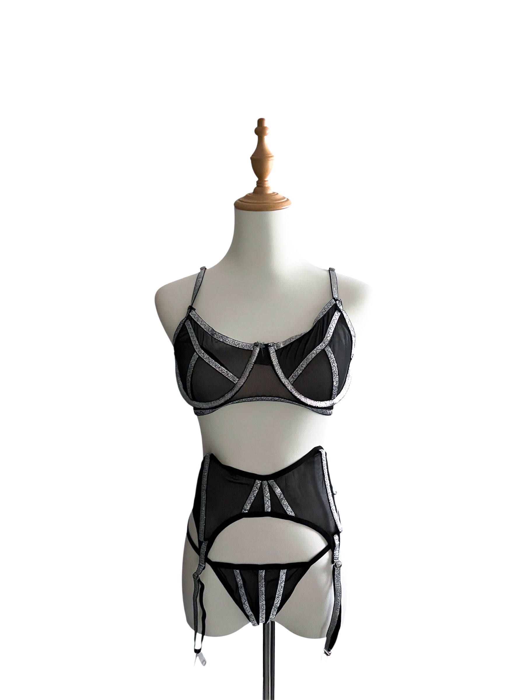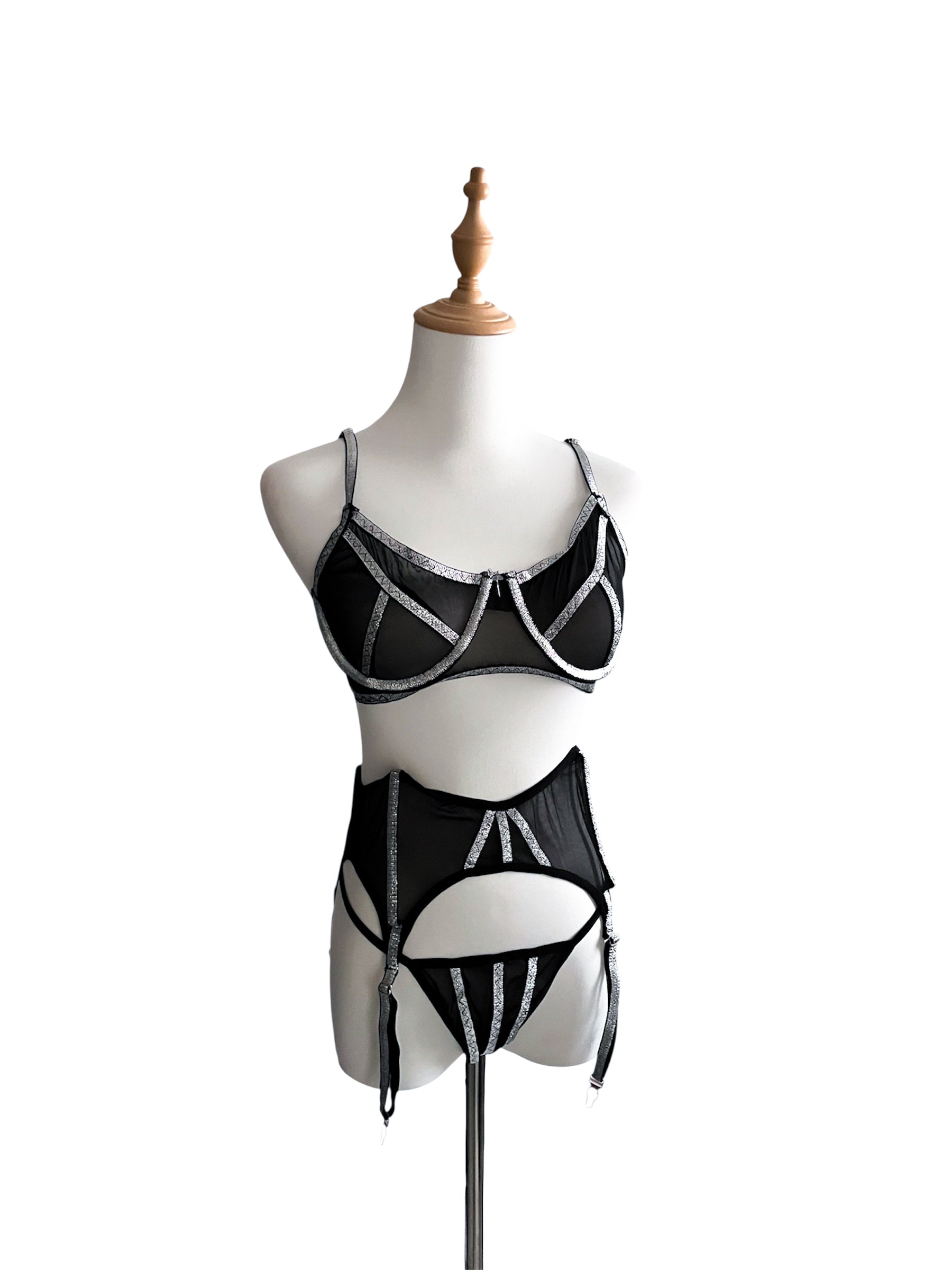 Incluye: 1 brassiere, 1 liguero, 1 tanga.