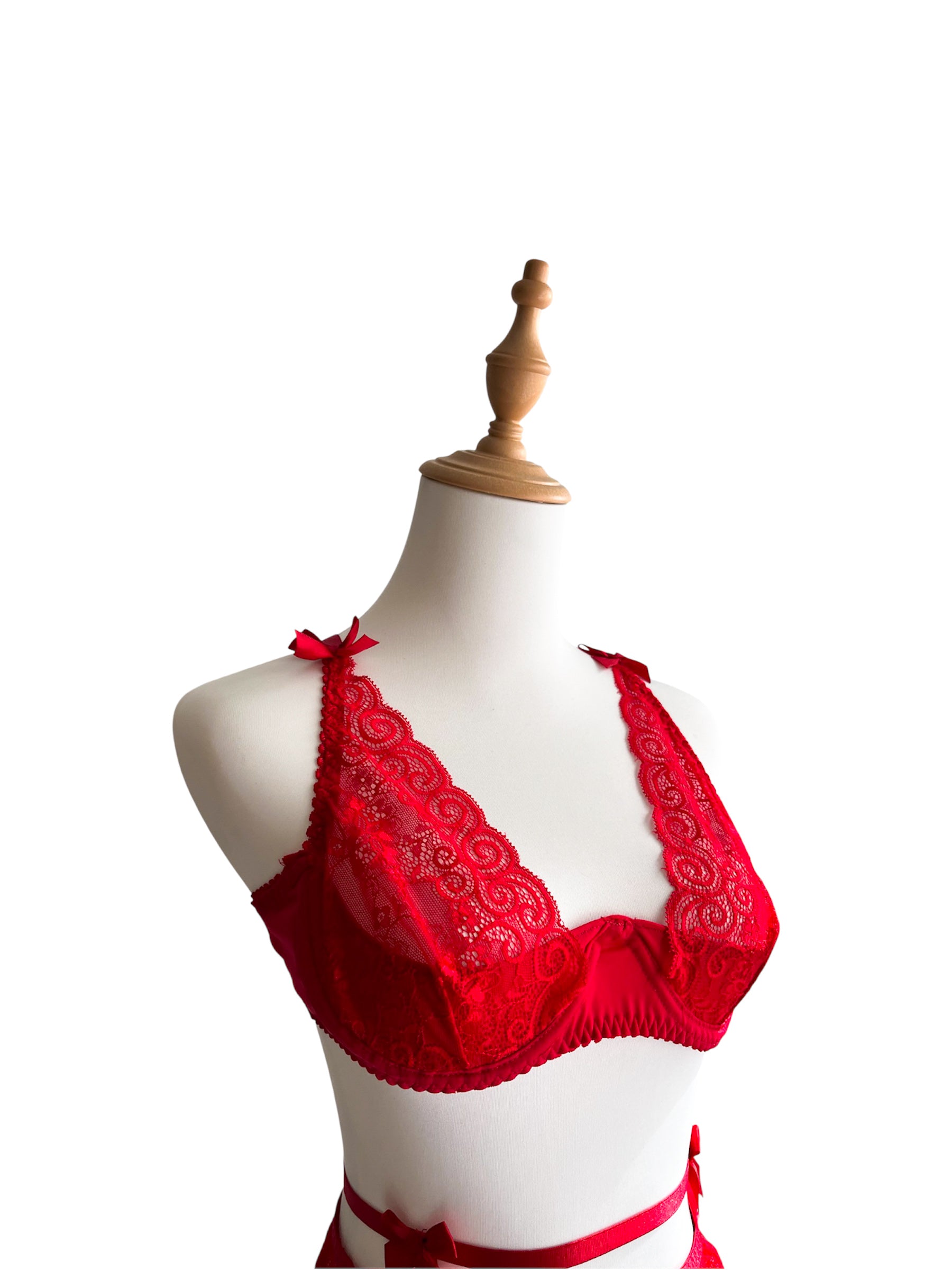 Incluye: 1 brassiere, 1 pantaleta, 1 liguero, 1 par de medias.