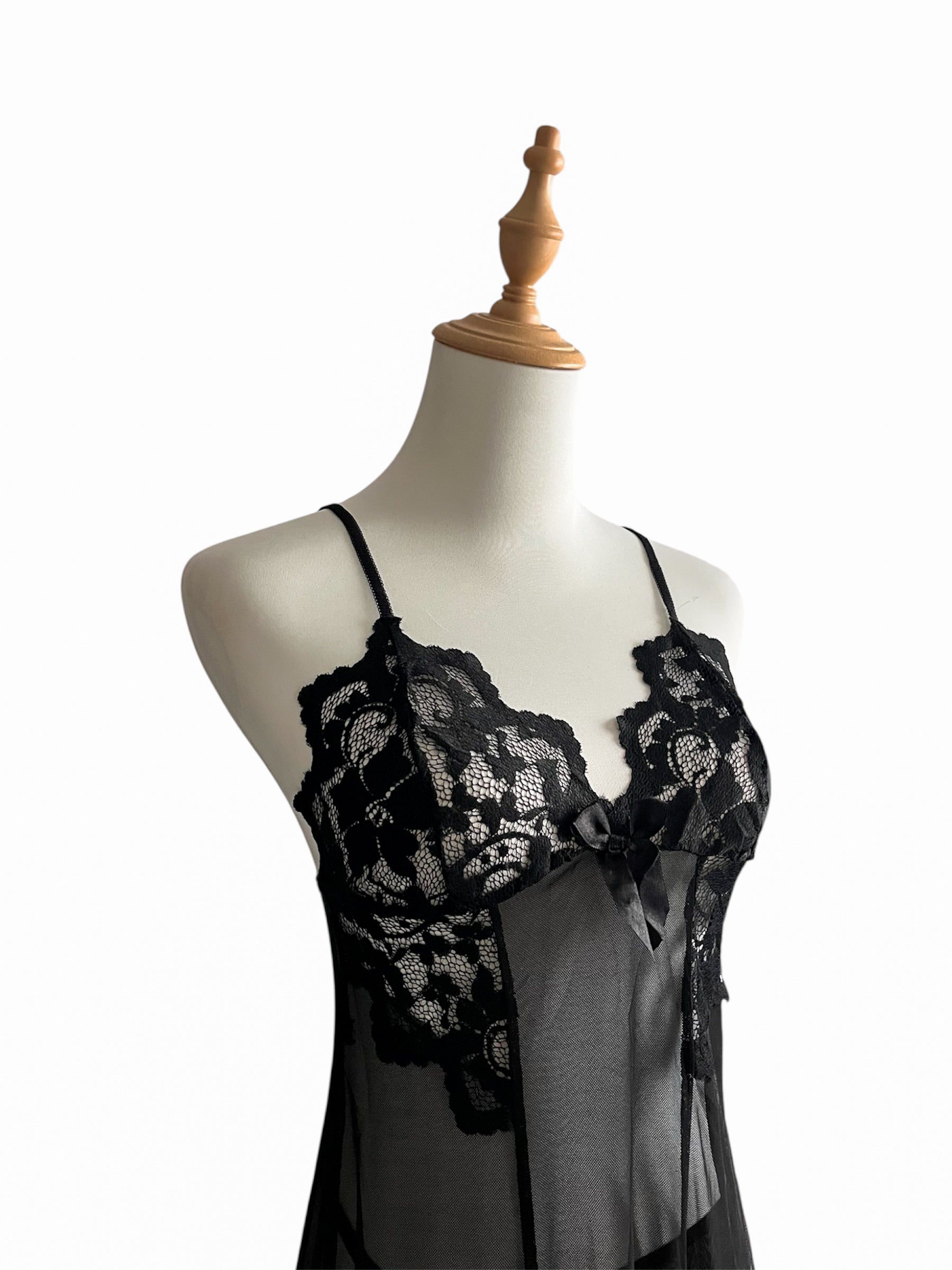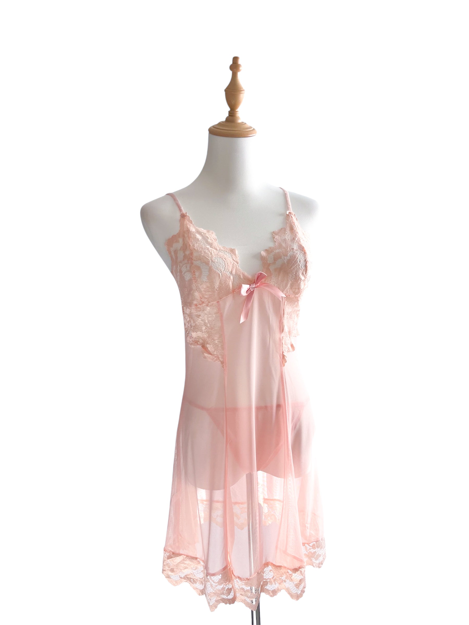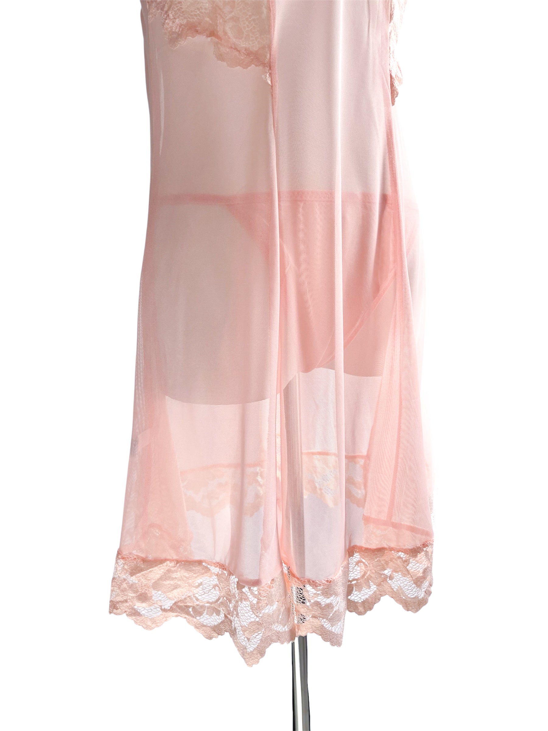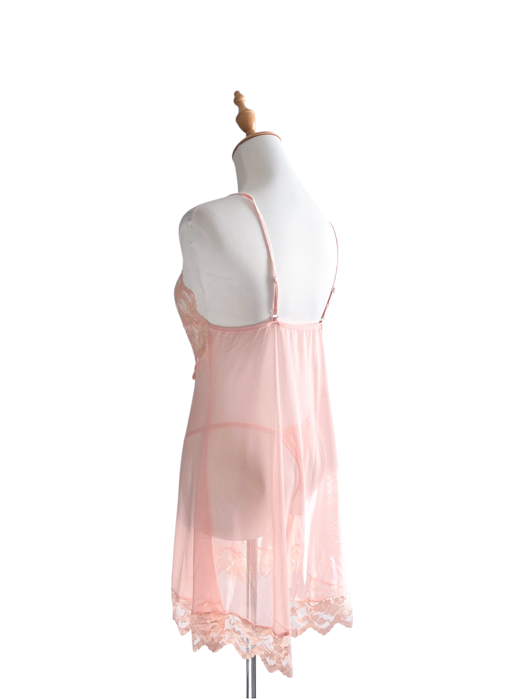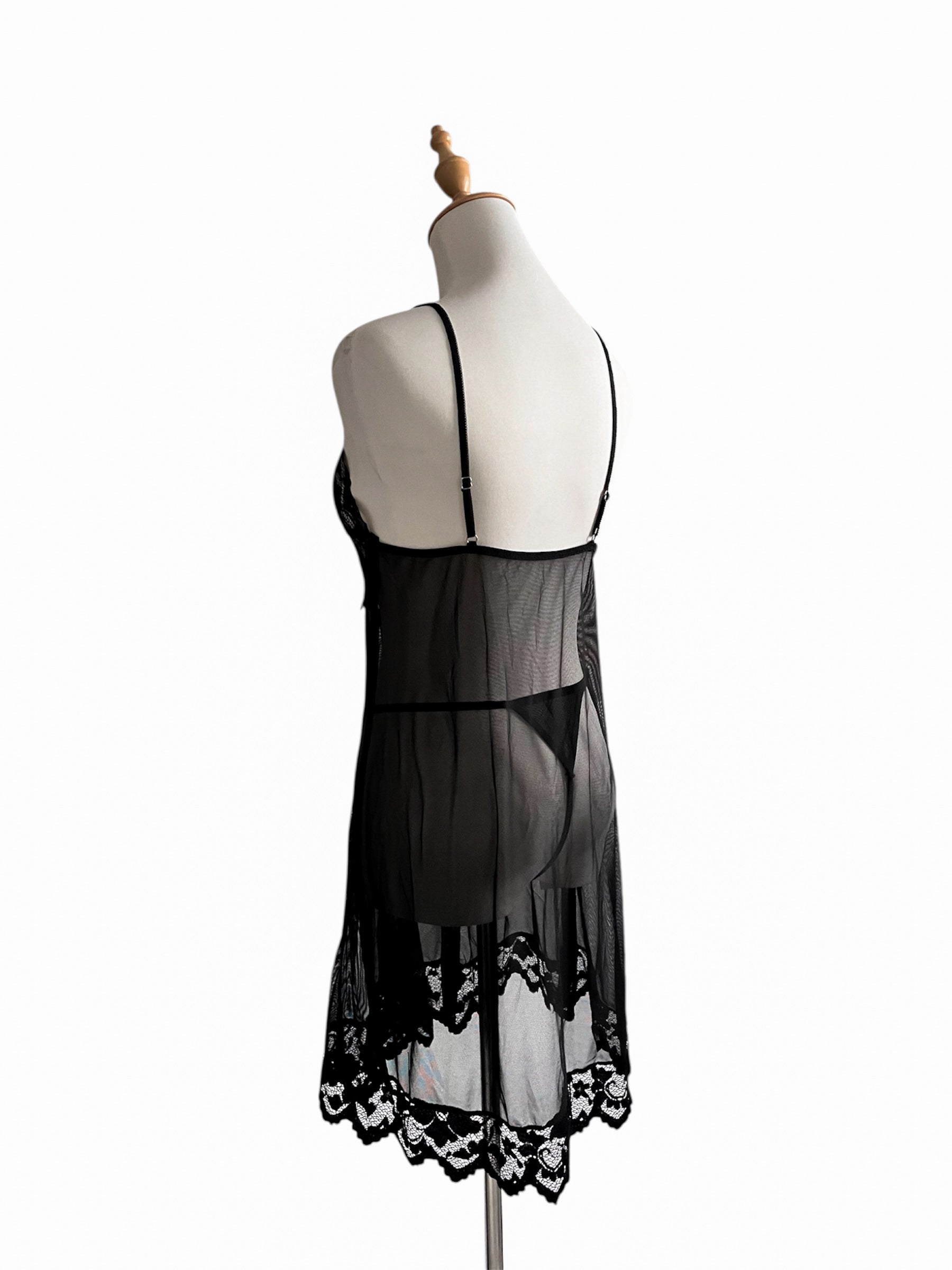 Baby Doll con encaje mesh transparente, tirantes ajustables, detalle bordado en parte inferior del vestido.