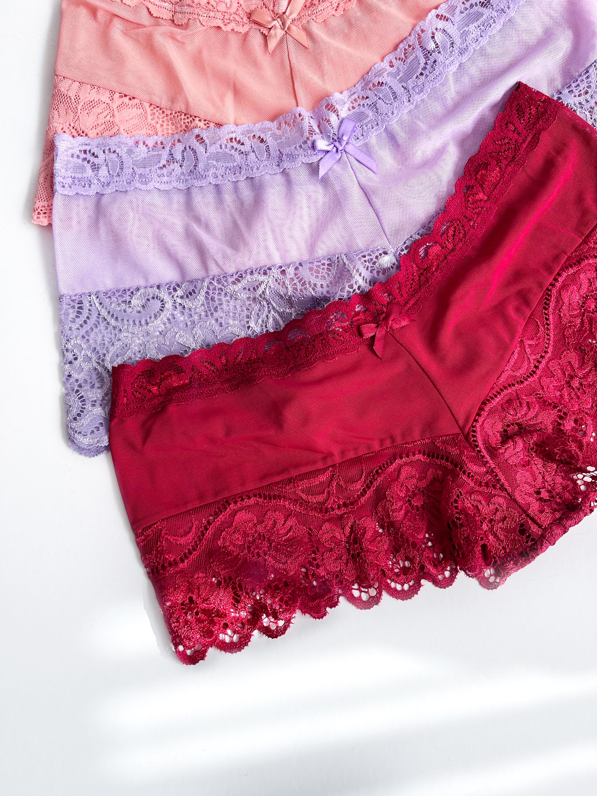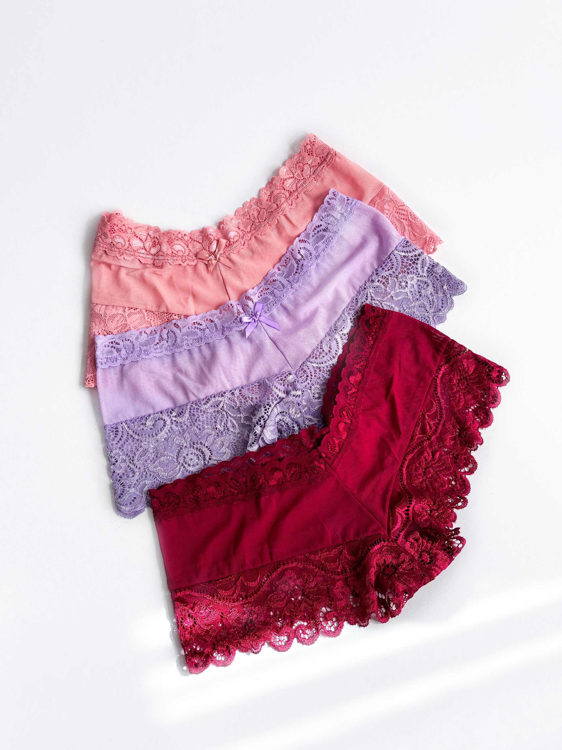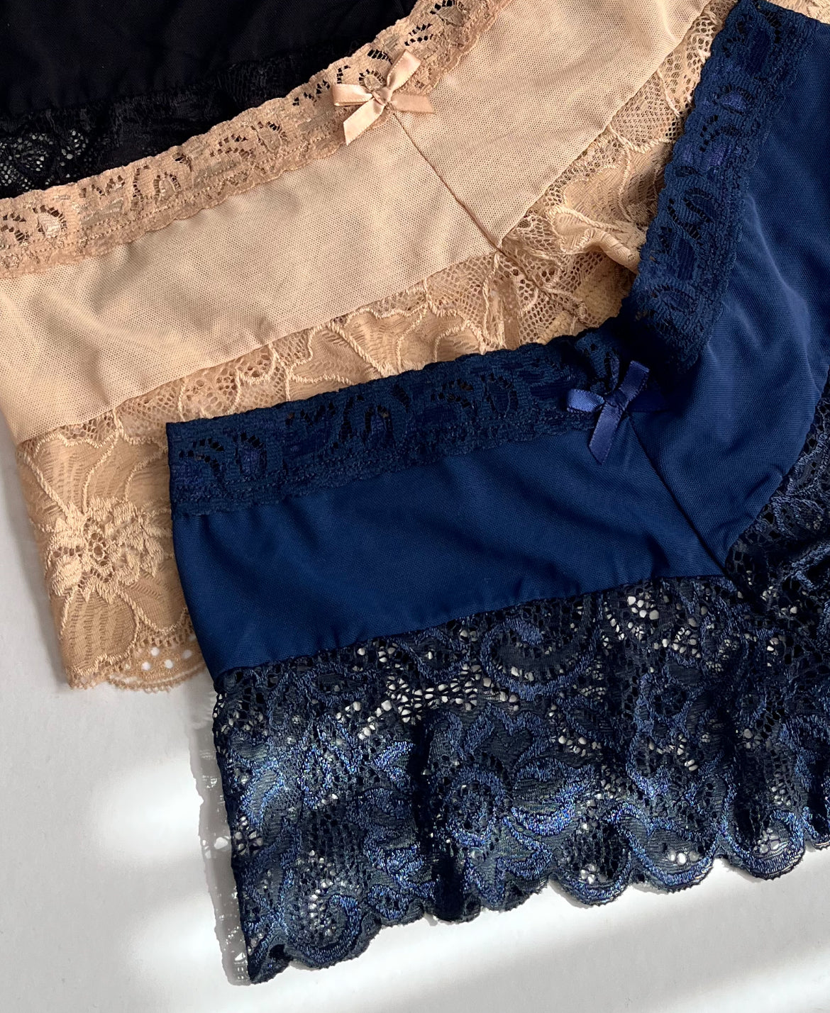 Set de 3 pantaletas corte cachetero, puente de algodón. Encaje grabado y mesh.