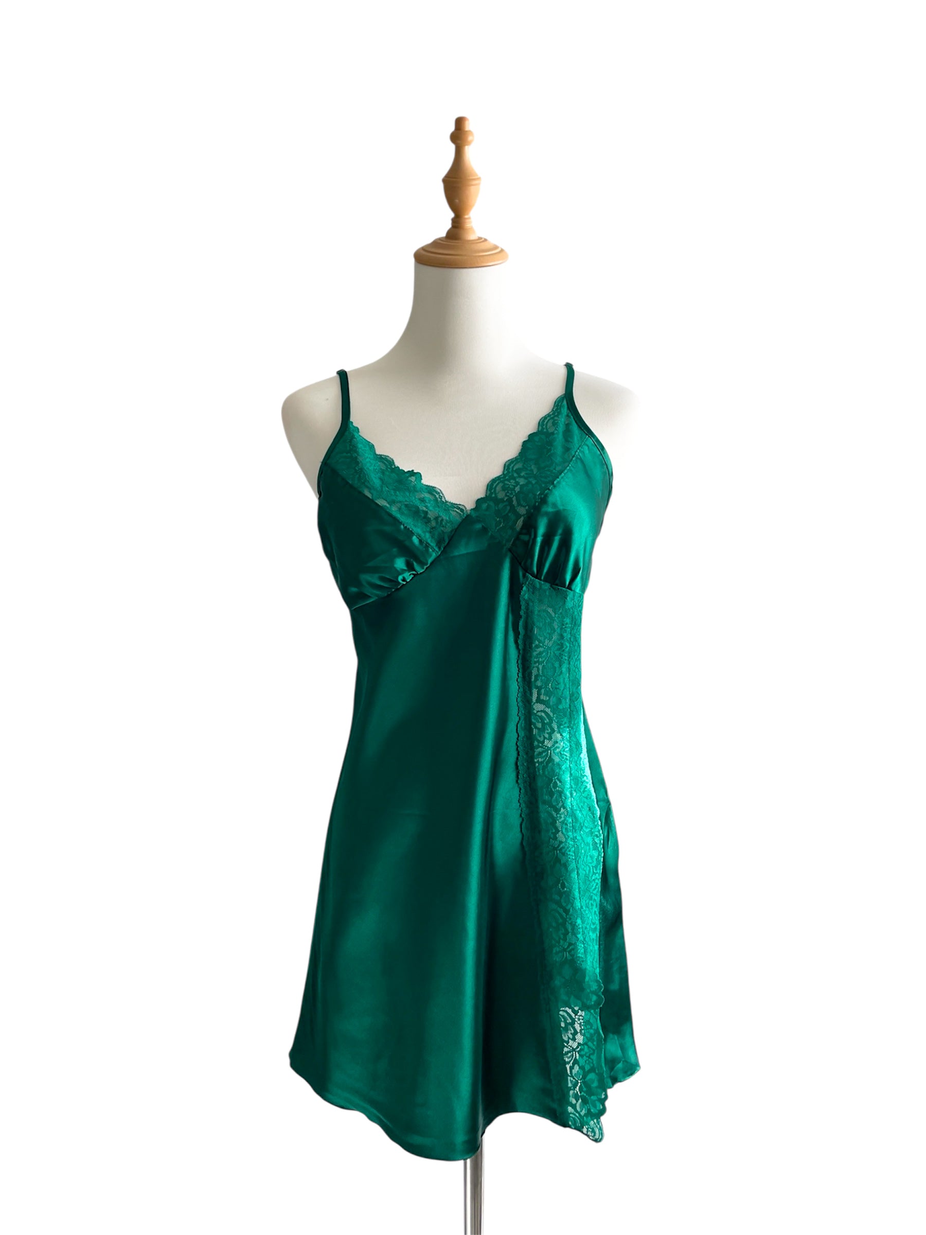 Vestido satinado con franja de encaje, tirantes ajustables. Sin forro.